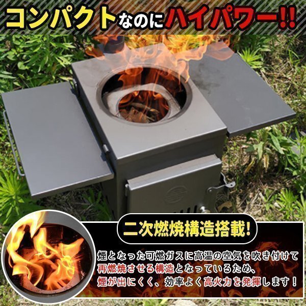 コンパクトでありながら二次燃焼構造搭載!燃焼によって発生した煙を再度燃焼することによってテントの穴あきも防げます。