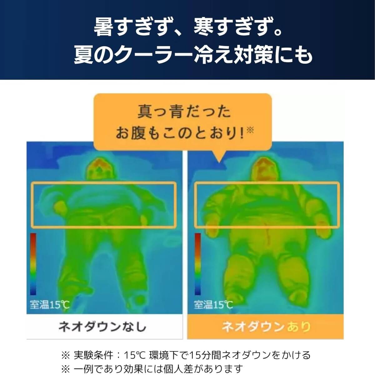 ・ネオダウンは、春・夏・秋口まで体を冷えから守り、ムレにくく快適!
