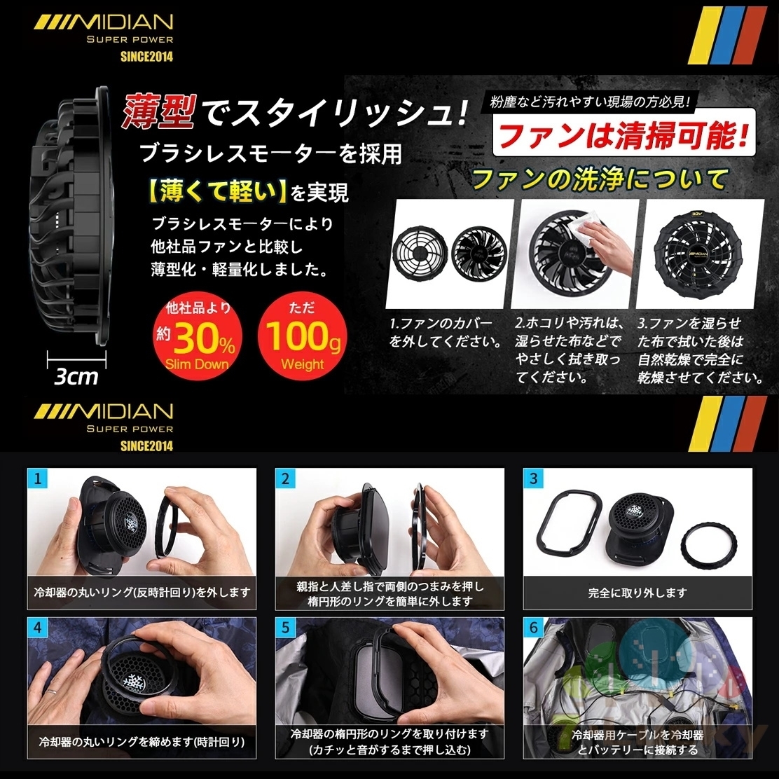 扇風機は5段階調節可能、冷却器は3段階調節可能です。冷却服には2つの使用モードがあります。モード1:冷却器と扇風機が同時に作動; モード2:扇風機のみ作動。冷却器のみの使用はお勧めしません!!