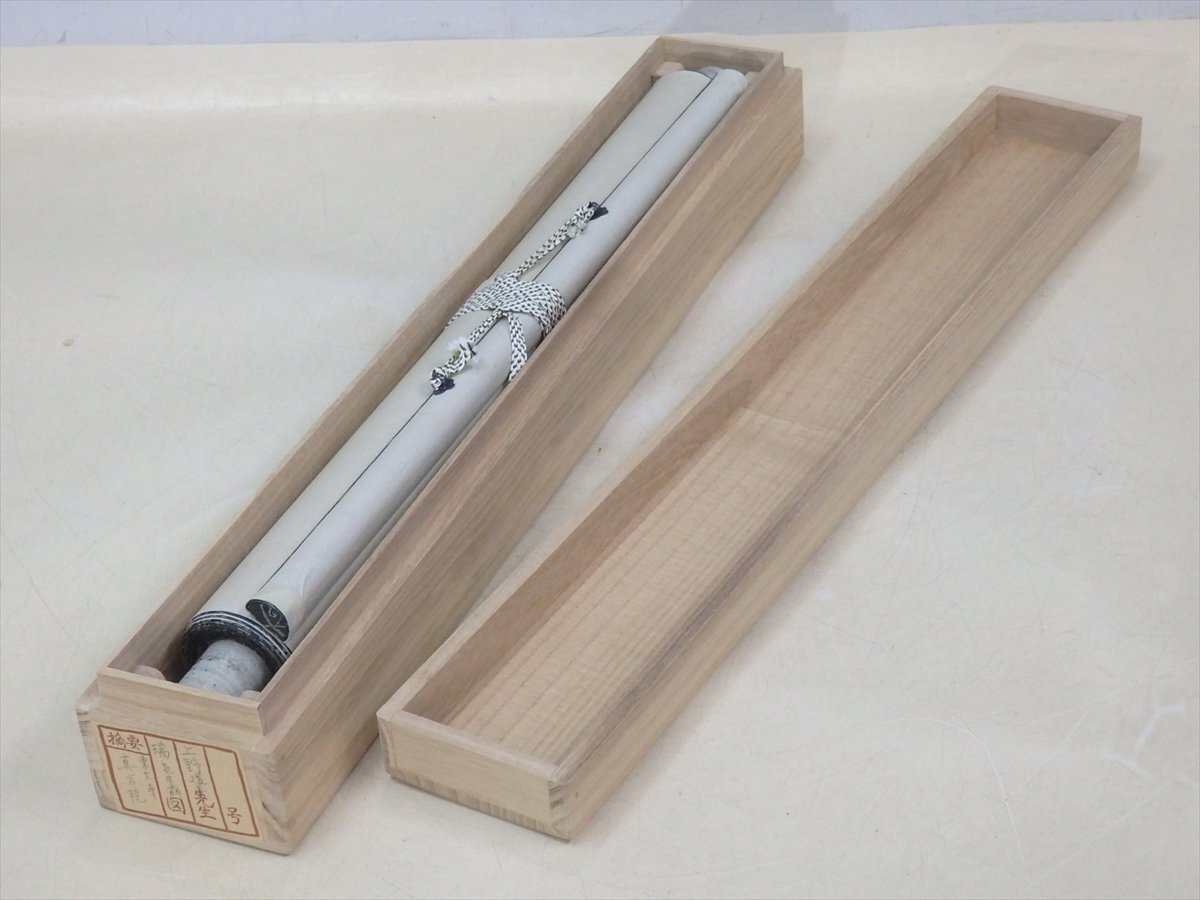 【管理番号5-0818122-8 スタッフコメント:iy】  めでたいことが起こる兆しが、すでにあなたの家の玄関先に集まっている。  ☆紙本、肉筆、軸先は陶器。折りジワが少々ありますが、しみはあまり目立ちません。木箱入り。