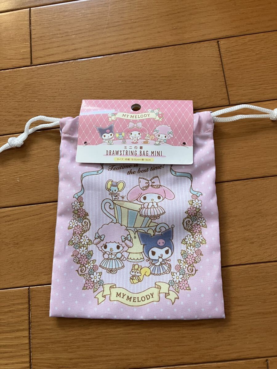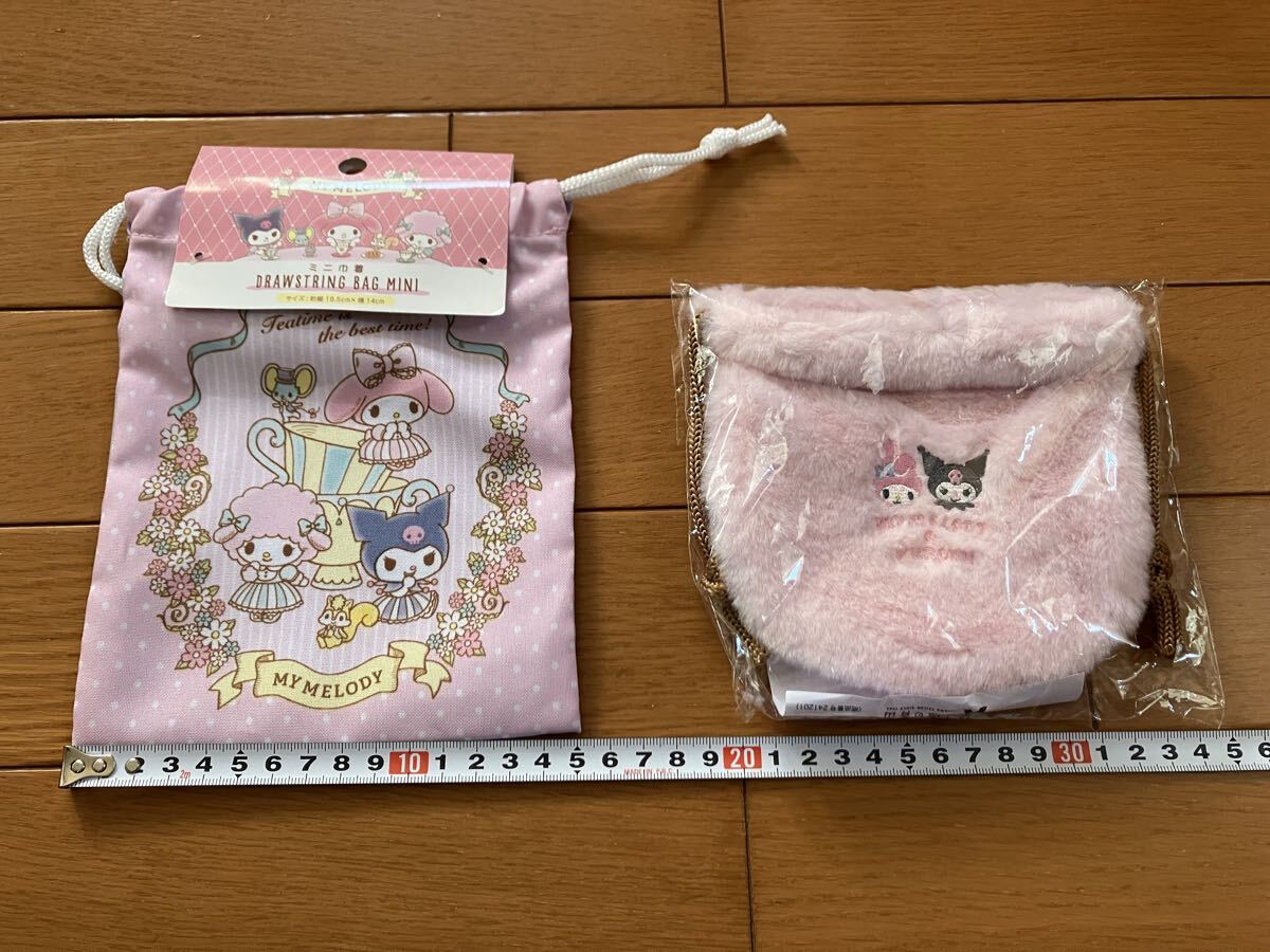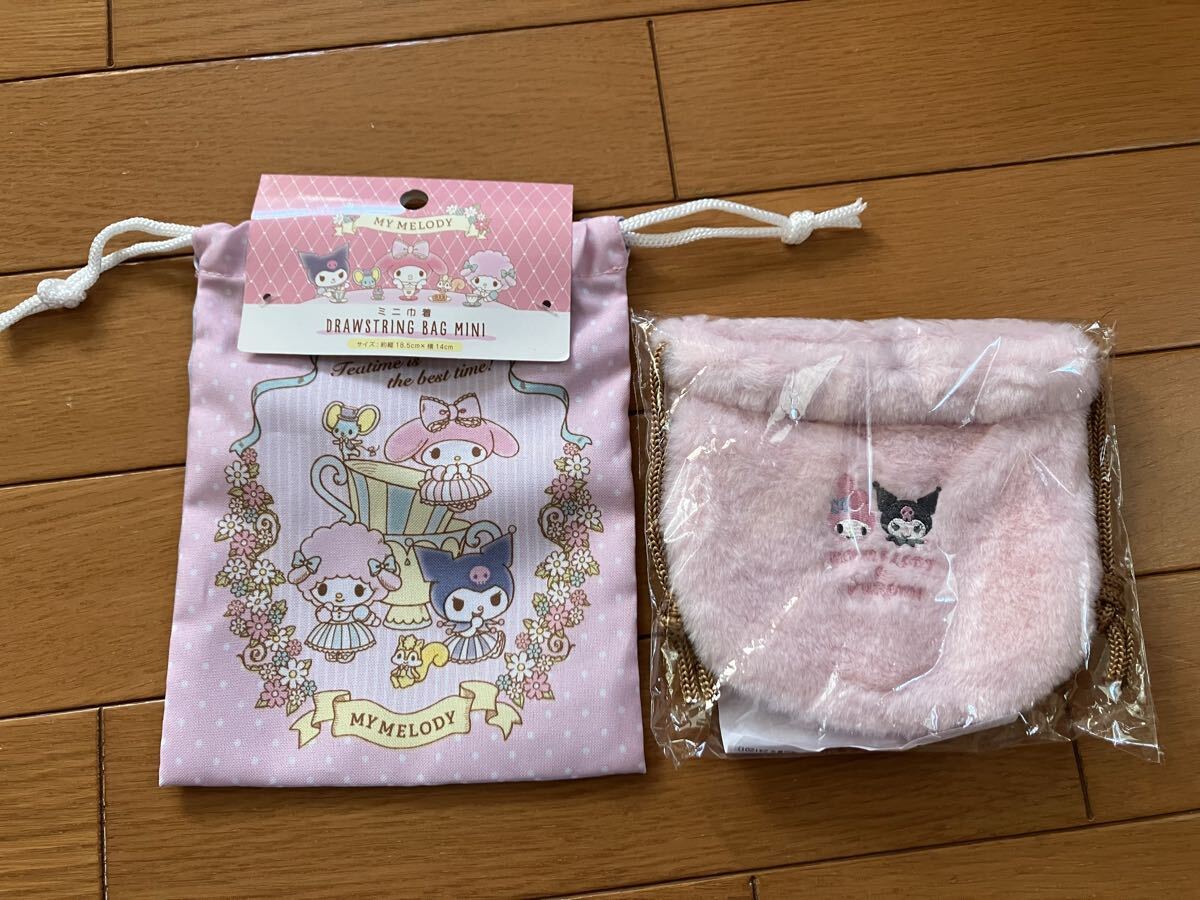 一つは「DRAWSTRING BAG MINI」と記載された、マイメロディとクロミ、マイスウィートピアノがティータイムを楽しむデザインの巾着です。いただき物になります。もう一つは、洋服の青山でいただきました、非売品で、ふわふわした素材で、マイメロディとクロミの顔が刺繍された巾着です。