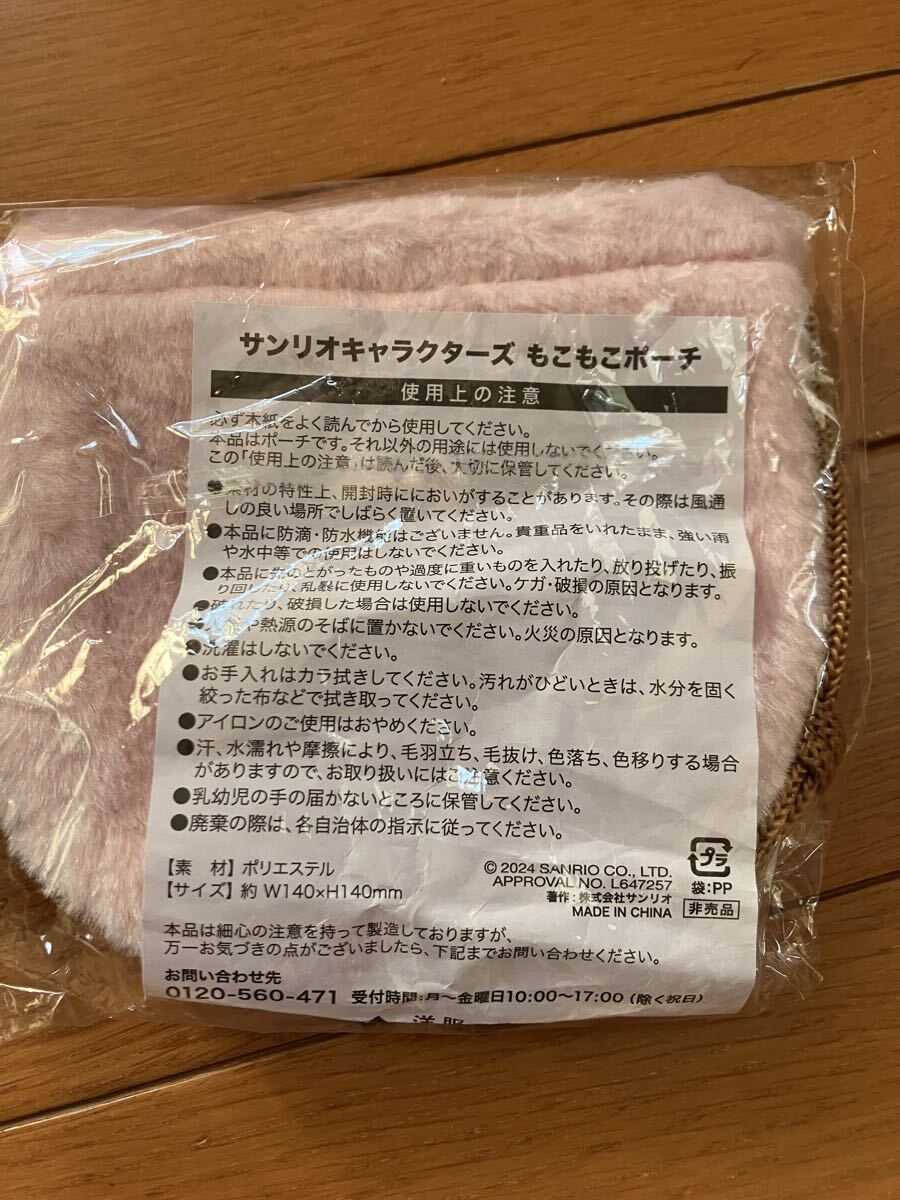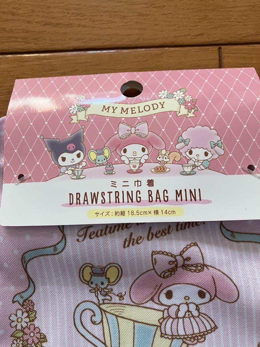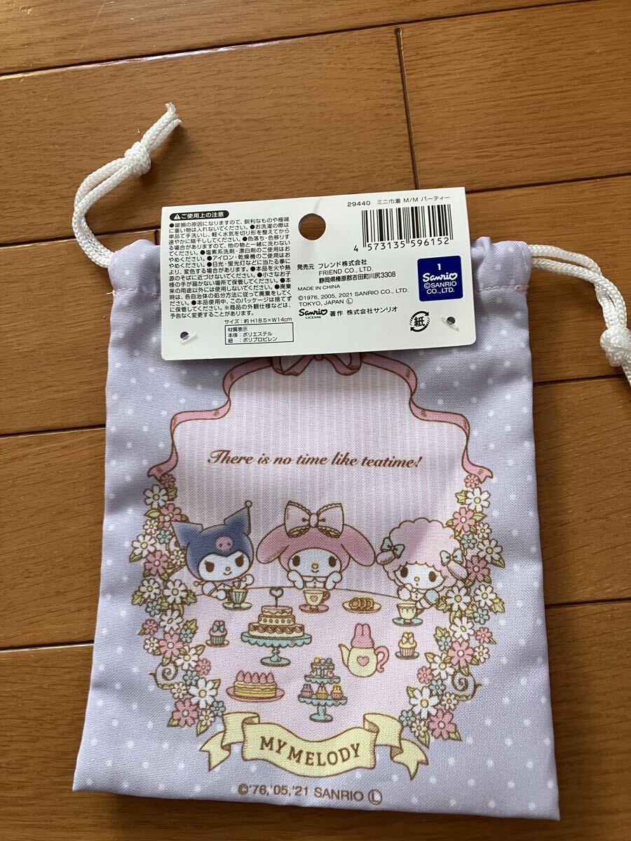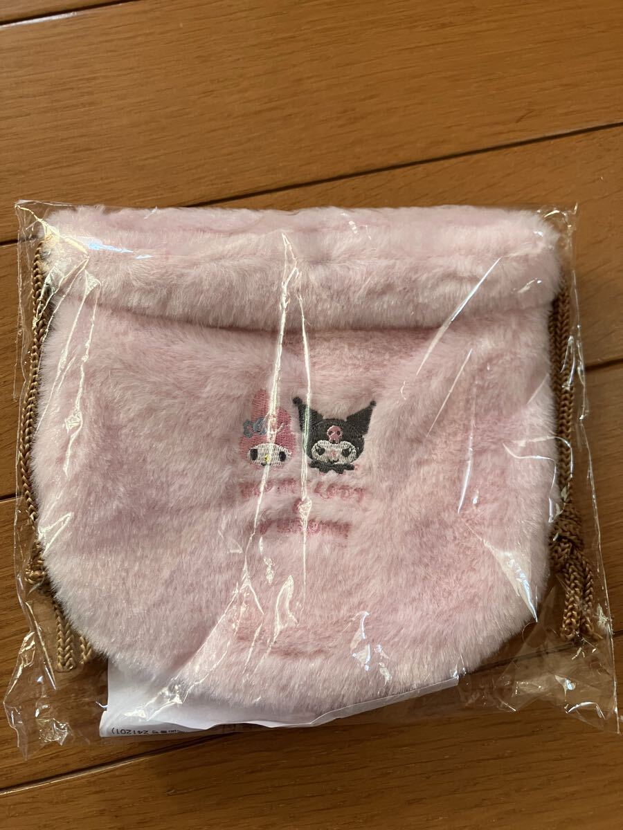 一つは「DRAWSTRING BAG MINI」と記載された、マイメロディとクロミ、マイスウィートピアノがティータイムを楽しむデザインの巾着です。いただき物になります。もう一つは、洋服の青山でいただきました、非売品で、ふわふわした素材で、マイメロディとクロミの顔が刺繍された巾着です。