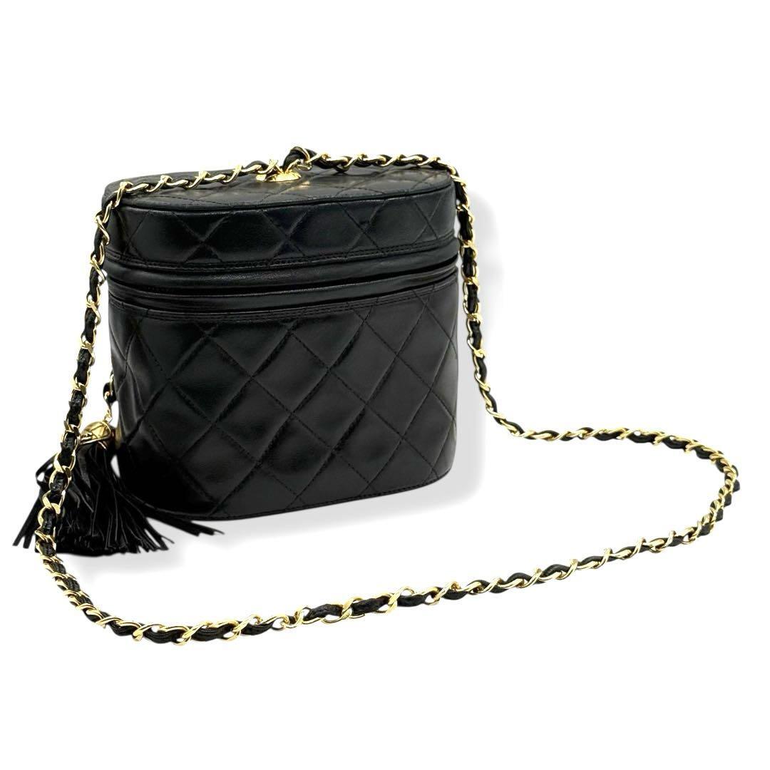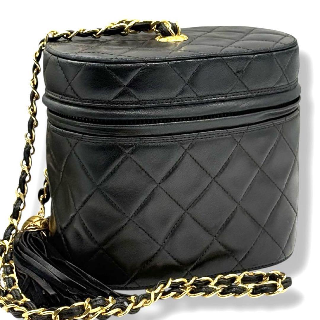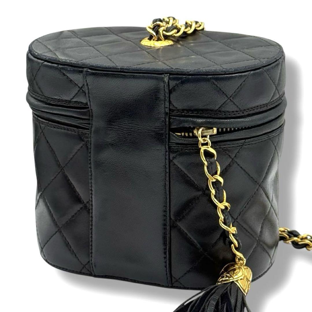 シャネルのチェーンショルダーバッグ、バニティ型マトラッセモデル。柔らかなラムスキンに施された美しいキルティングと、揺れるタッセルがリュクスな表情を添えています。