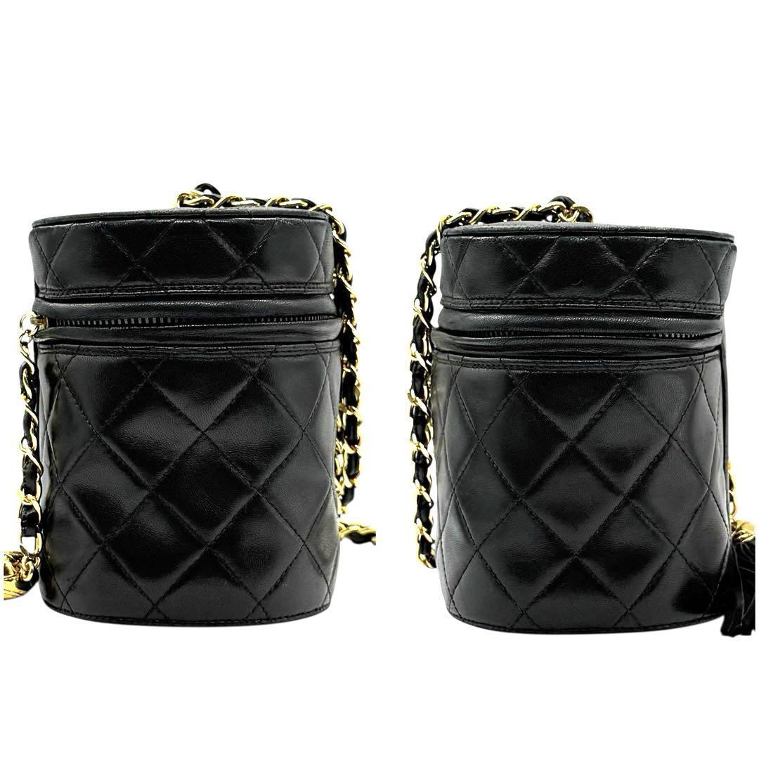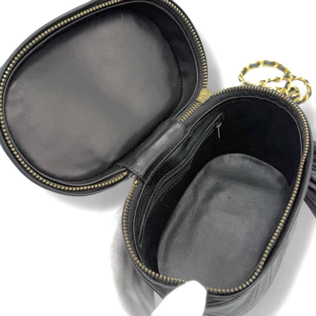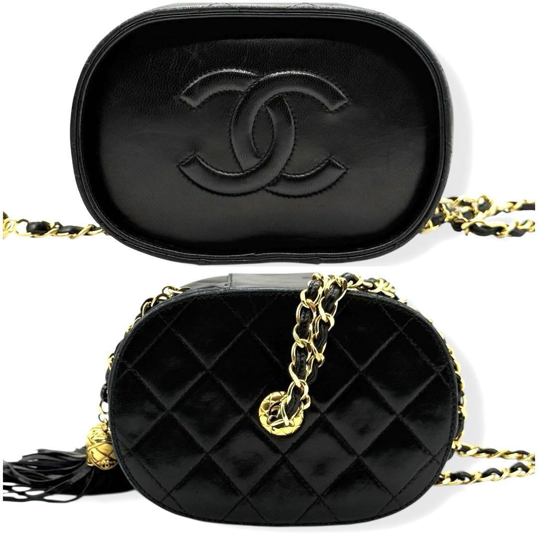 シャネルのチェーンショルダーバッグ、バニティ型マトラッセモデル。柔らかなラムスキンに施された美しいキルティングと、揺れるタッセルがリュクスな表情を添えています。