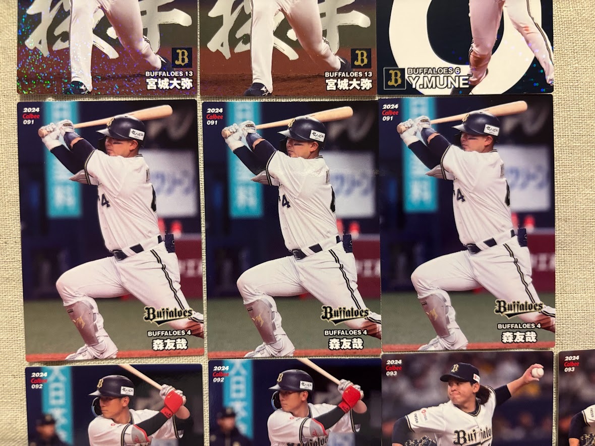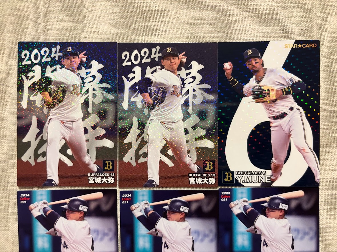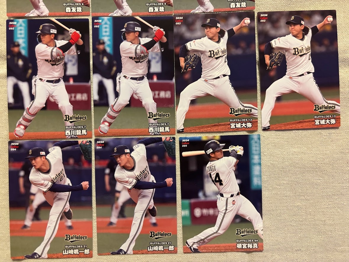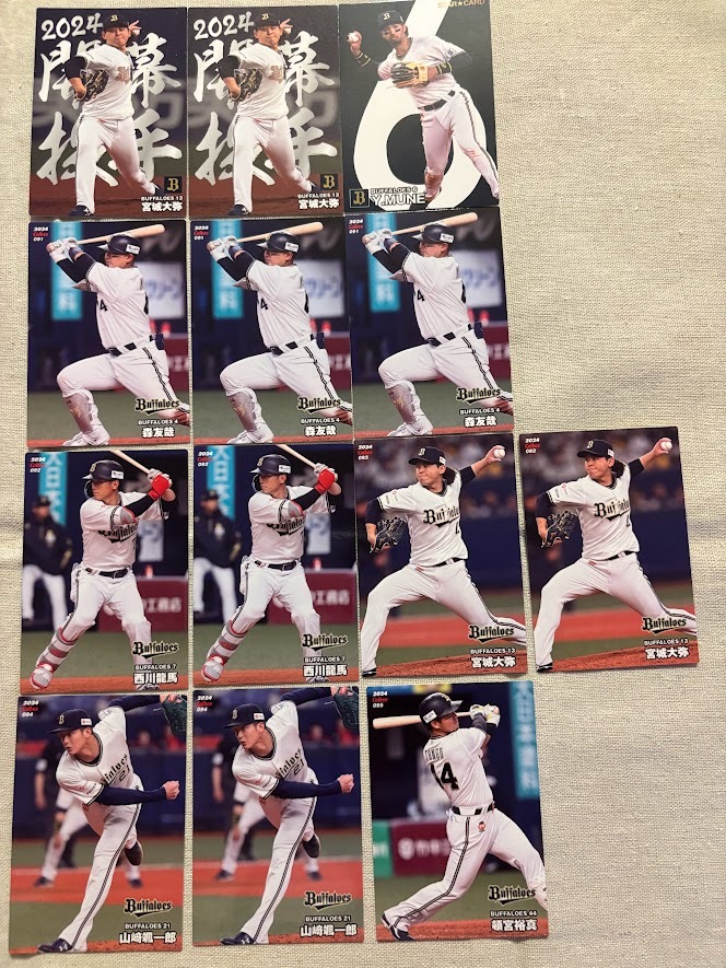 カルビー プロ野球チップス2024 第2弾 オリックス・バファローズ ■開幕投手カード 宮城大弥×2枚 ■スターカード 宗佑磨 ■レギュラカード 森友哉×3枚 西川龍馬×2枚 宮城大弥×2枚 山崎颯一郎×2枚 頓宮裕真 以上の計13枚セットです。 開封後、この13枚をまとめて袋に入れて保管しておりました。 神経質な方はご遠慮ください。 | ||||||||