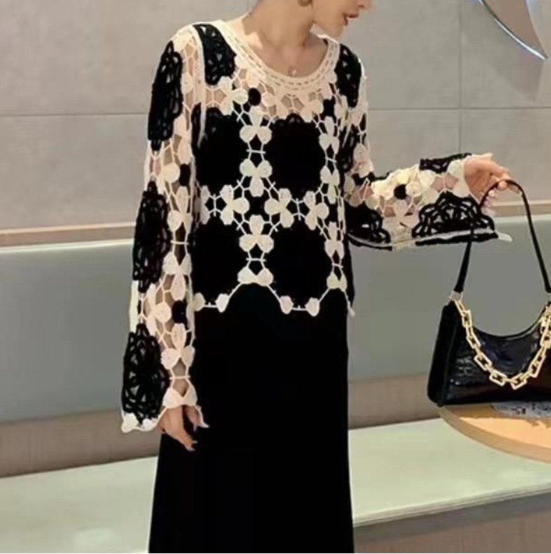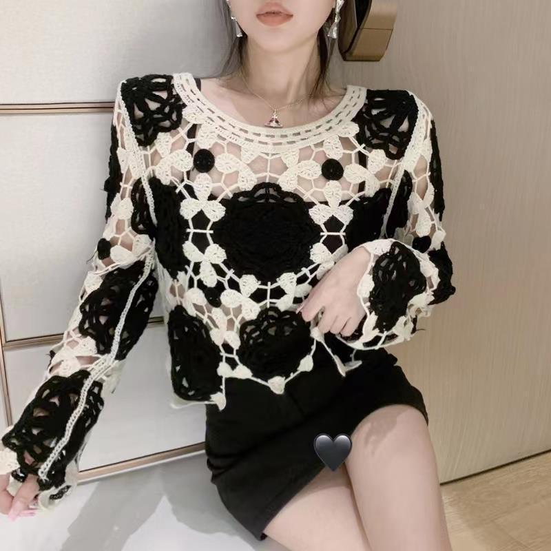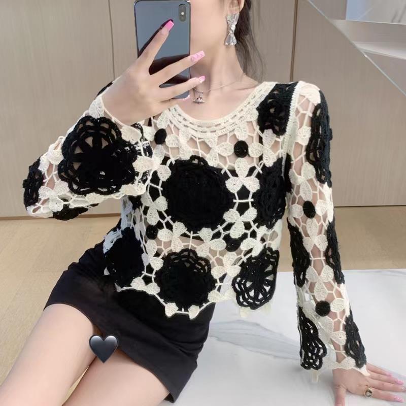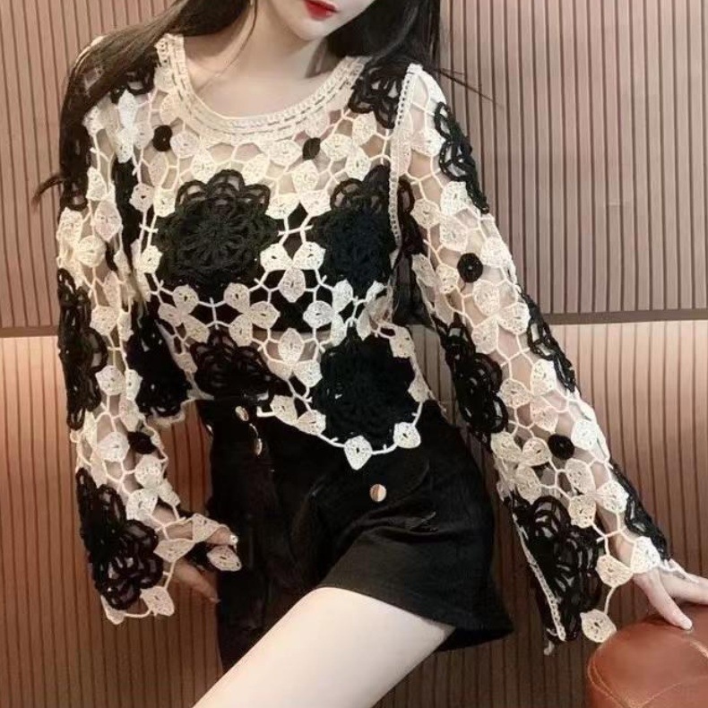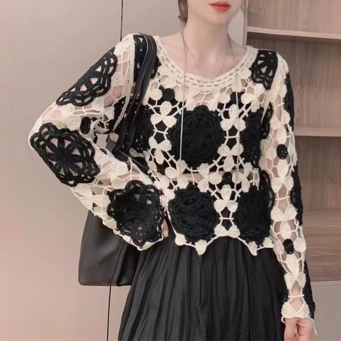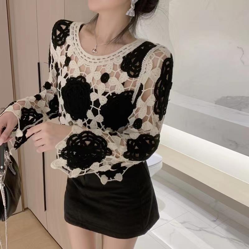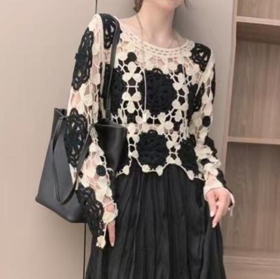 人気品上品長袖トップス クロッシェレース 透け編み バイカラー ゆったり 花びら レース sweet系
