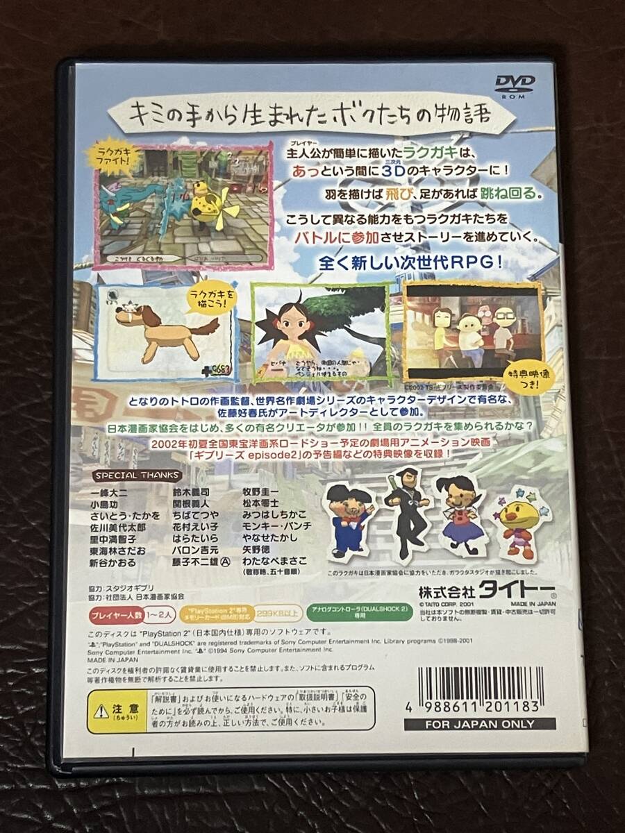 品名: ガラクタ名作劇場 ラクガキ王国 メーカー名: TAITO 型番: SLPM 65097 対応機種: PS2 20GB/60GBモデルの後方互換性持ち初期型PS3 状態説明: 状態はそれなりかと思います。 商品説明: コントローラーのアナログスティック を用いてプレイヤーが自由に描いた 「落書き」が、3Dポリゴンの キャラクターとなって動いてくれる、 というシステムが特徴的な RPGです。 出るのが早すぎたゲームといえます。 今の時代であれば、デジタル絵は、 プロでなくても道具揃えたら書けますし、 在野の絵描きが溢れている訳ですから。 スタジオジブリや日本漫画家協会など、 アニメーションや漫画のプロが協力した ゲームであり、宣伝にも それが押し出されていたため、 絵がうまくかけるプロじゃないと 楽しめない敷居の高いゲームと 思われてしまった残念なゲームでもあります。 ですが、実際にやってみたら、 敷居は低く、それでいて、自分が描いたキャラが 動いてくれるのを手軽に味わえて、 別に異様に上手くなくたって、 自分で描いて、楽しめるんだって分かるように なっているので、前評判とやってみての評価に 乖離があるゲームでもあります。 間違いなく配信映えもするでしょうし、 割と最近、スマホゲーとして、 このシリーズの最新作が 出たりもしました。 とにかく、 描くことが好きな人にオススメなゲームです。 興味ある方、いかがでしょうか。 →このソフトについての詳細はこのリンクを御参照ください。 |
