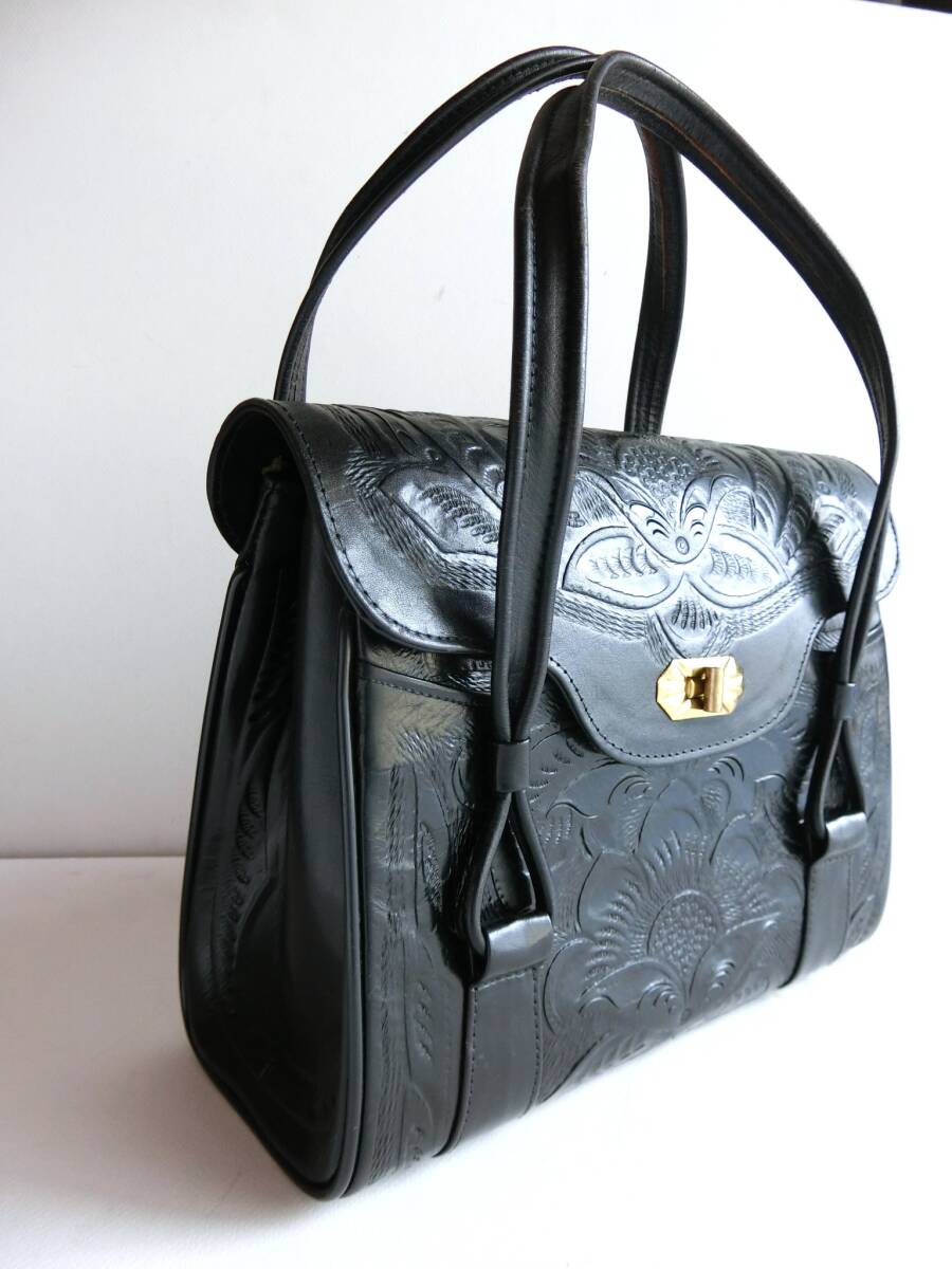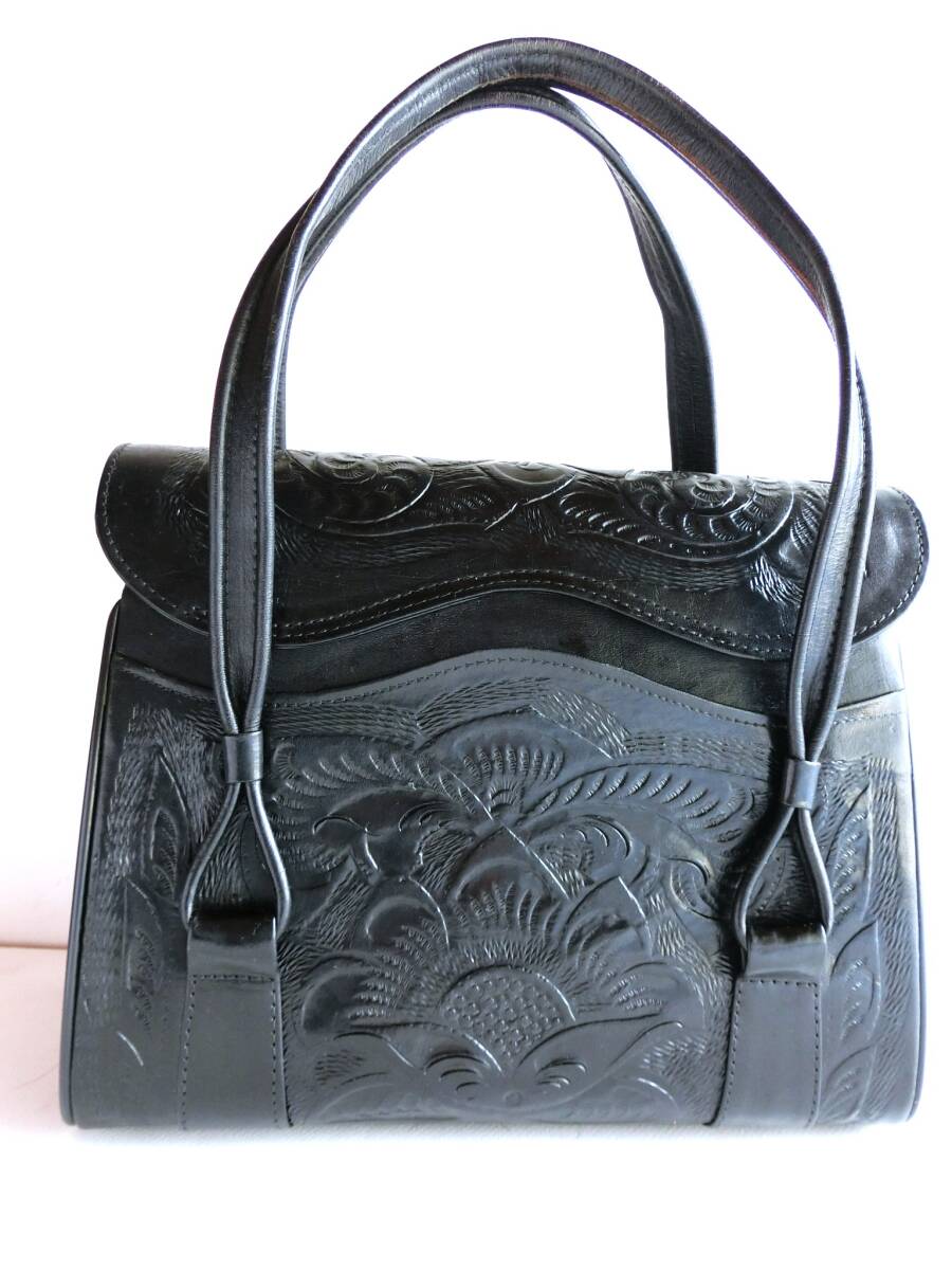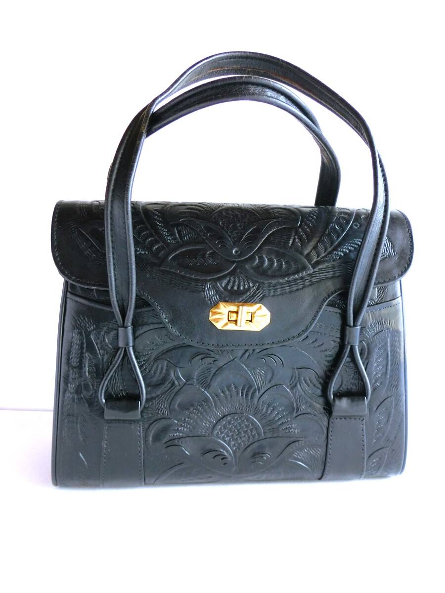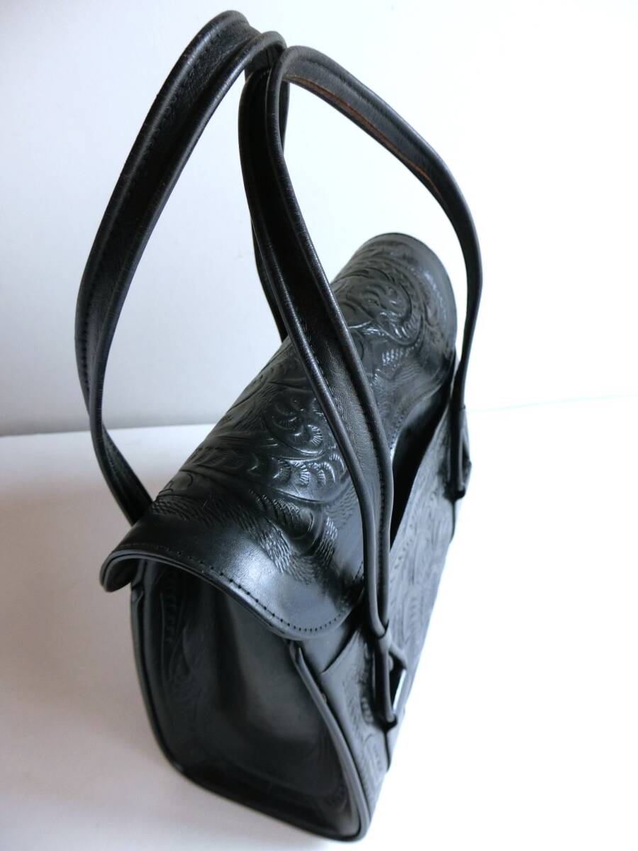 ヴィンテージ カービングレザー 本革レザー ハンド バッグ ブラック メキシコ製 型押し 黒 レトロ フォークロア 男女兼