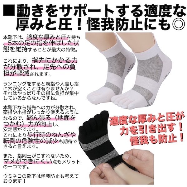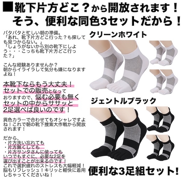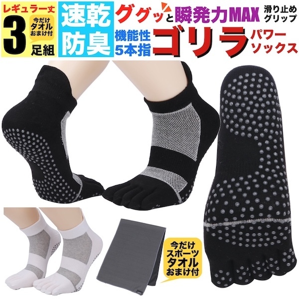 | ■■■店長のコメント■■■ ■ググッと瞬発力MAX!滑り止めソール グリップ 5本指 パワーソックス 速乾防臭!雑菌抑制! メンズ ソールシリコン 5本指ソックス『ゴリラ』3足組セット 今だけスポーツタオルのおまけ付き ■ウミネコが求めたお客様にお喜びいただくための条件とは!? 1.とにかく踏ん張れる!超級パワーを手にしたい! しっかり力を伝えられるようなパワフルなソックスがいい! 2.つま先とかかとが破れにくい!スレにも強い! やはりアクティブに使うものだからタフなソックスがいい! 3.怪我防止&動きをサポートしてくれる! 適度な厚みの生地と適度な圧と伸縮性で足全体を包み込んで動きをサポートし怪我も防止したい! 4.「よし!蒸れてない!」すぐ乾いて臭わない! 休憩中や更衣室でも安心の速乾消臭効果が欲しい。 5.「靴下片方どこいった!?」に終止符を! これ以上、片方の靴下探しで朝の貴重な時間を無駄にしたくない! 6.どんなスポーツウェアでもおしゃれにキマる! どうせなら自信が湧くくらいシンプルでおしゃれでスタイリッシュな方がいい。 7.「え?ほんと?」って思うほどお得であること! お得なおまけがついているうえに、上記スペックを持ちながらメーカーでは到底実現しない圧倒的にお財布に優しい価格であること! ウミネコの商品は全条件達成!! 自信を持って喜んでいただける商品をご用意いたしました! ■トップアスリートも多数愛用する5本指ソックス! 5本指ソックスの最大の特徴はなんと言っても、 一般的な靴下では使えなかった「小指」や「薬指」が自由に動かせること! これにより、グリップ感が増加し、地面をしっかりつかめるようになります! また、足元が安定するため力を込めやすく踏ん張りが効くようになりますので、本来持っている自分のパワーを効果的に伝達することができます! さらに、地面をしっかりつかめる感覚はバランス感覚の向上にも繋がります。 トップアスリートも多数愛用する5本指ソックスはググッと踏ん張りの効くまさにパワーソックス! 力の湧き上がりを是非体験してくださいね! ■『つま先』と『かかと』も十分に補強しました!! ジムなどの更衣室で 「あ!!穴が空いてる(汗)」 なんていうご経験は誰しもあるかと思います。 これは地味に恥ずかしい気持ちになりますよね。 穴の空いたつま先をつまん伸ばして、隠してみたりしますが、その行動は怪しく見えますし、やはり穴は隠しきれません。 耐久性の高い靴下だったら良かったのに・・・。 ご安心ください!本靴下はつま先、かかとを強化して破れにくく仕上げております! 貴殿の超アクティブな活動においても、きっと優秀な相棒となってくれることでしょう! ■動きをサポートする十分な厚みと圧!怪我防止にも◎ 本靴下は、適度な厚みと圧を持ち、5本の足の指を伸ばした状態を維持することが最大の特徴。 これにより、指先にかかる力が分散され、足先への負担が軽減されます。 ランニングをすると親指や人差し指に穴が空くことは有りませんか? それはやっぱりその指に負担が集中しているからなんですね。 本靴下なら指先への力が分散され、薬指や小指がしっかり使えるようになるので、踏ん張る(地面をつかむ)力が向上し、安定感がでます。 これにより歩行時のねんざや転倒の危険性の減少も期待できると言えます。 また、指同士がこすれないため、マメができにくい点もメリットの一つです。 ウミネコの靴下は怪我防止も考えております! ■吸汗速乾生地で抑菌消臭!ジムや更衣室でも安心の防臭効果! 足の悪臭の原因の一つである汗。そして汗による蒸れで、靴下内は雑菌の絶好の増殖環境となります。 本靴下は雑菌の増殖の原因となる汗蒸れを解決! 吸汗速乾特性のある生地により、従来品に比べ、効果的に汗を吸い取り、歩くごとに呼吸するように乾燥を促していきます。 これにより靴下内環境の蒸れを解消し、雑菌の繁殖を抑え、ニオイが発生しづらい環境を作ることができました。 また、その通気性とよく乾きやすい生地により、足元を清潔に保ちます。 肌触りの良い生地は程よい厚さに仕上げ、乾きやすいからお洗濯も楽ちん! メリットを沢山感じて頂けるような仕様に仕上げております。 ■靴下片方どこ?から開放されます!そう、便利な同色3セットだから! 本靴下ならもう大丈夫! セットでの販売となっておりますので、悩む必要も無くセットの中からササッと2足選べば良いのです! 異色カラーで合わせてもオシャレですよね!これで朝の靴下捜索大作戦から開放されます! だから、 ・片方洗い忘れても ・片方無くしても ・片方サンタさんに使っても いつでもすぐに、必要な2足を 選び出すことが出来るのです! これで選択疲れのストレスも大幅軽減!脳もリフレッシュ!キリッと軽快に着用しちゃってくださいね! ■今だけお得なおまけ付き! 水に濡らして振るだけカンタン!! 【極涼爽快 スゴ冷 やわらか冷感スポーツ・トレーニング タオル】 今だけ購入者様全員にこちらを1枚プレゼント! ウミ