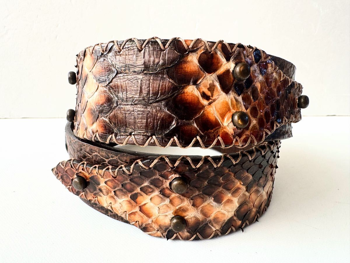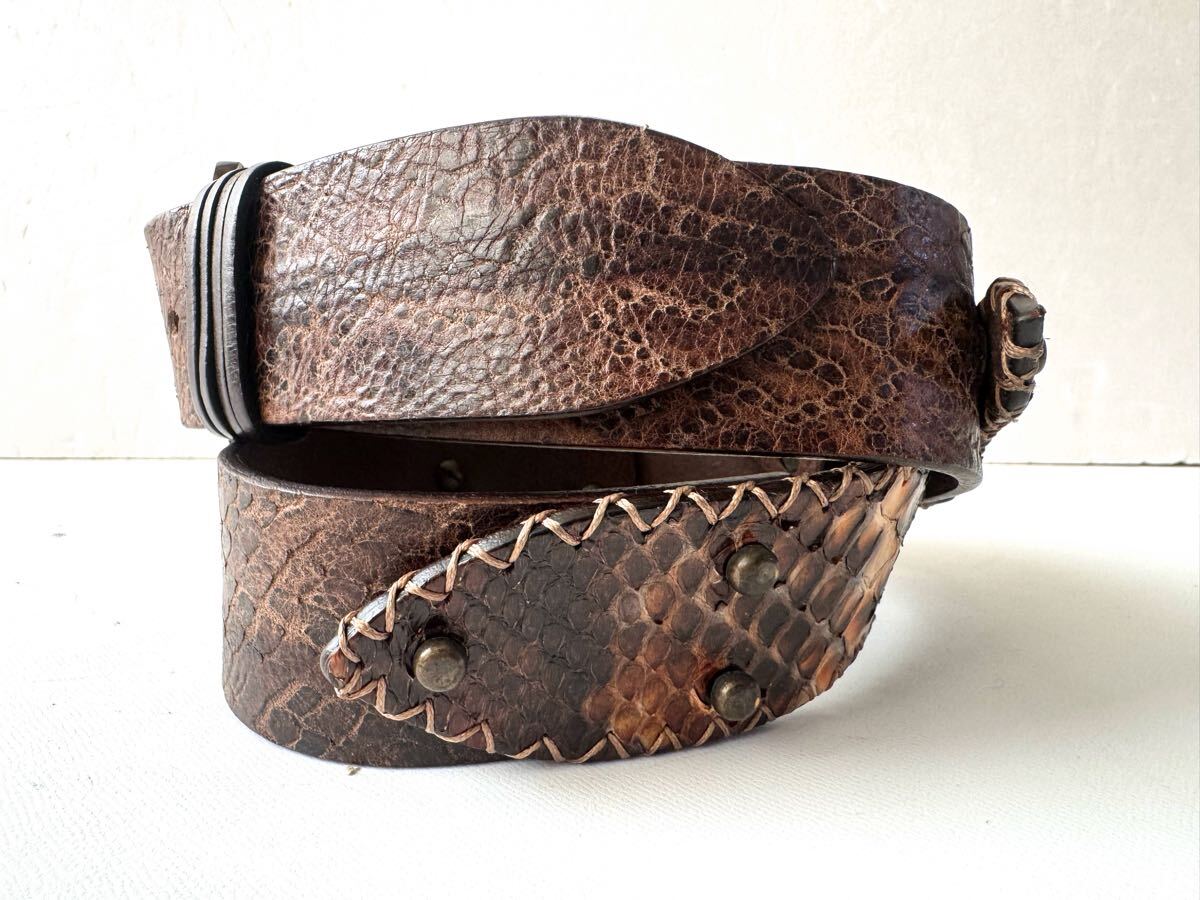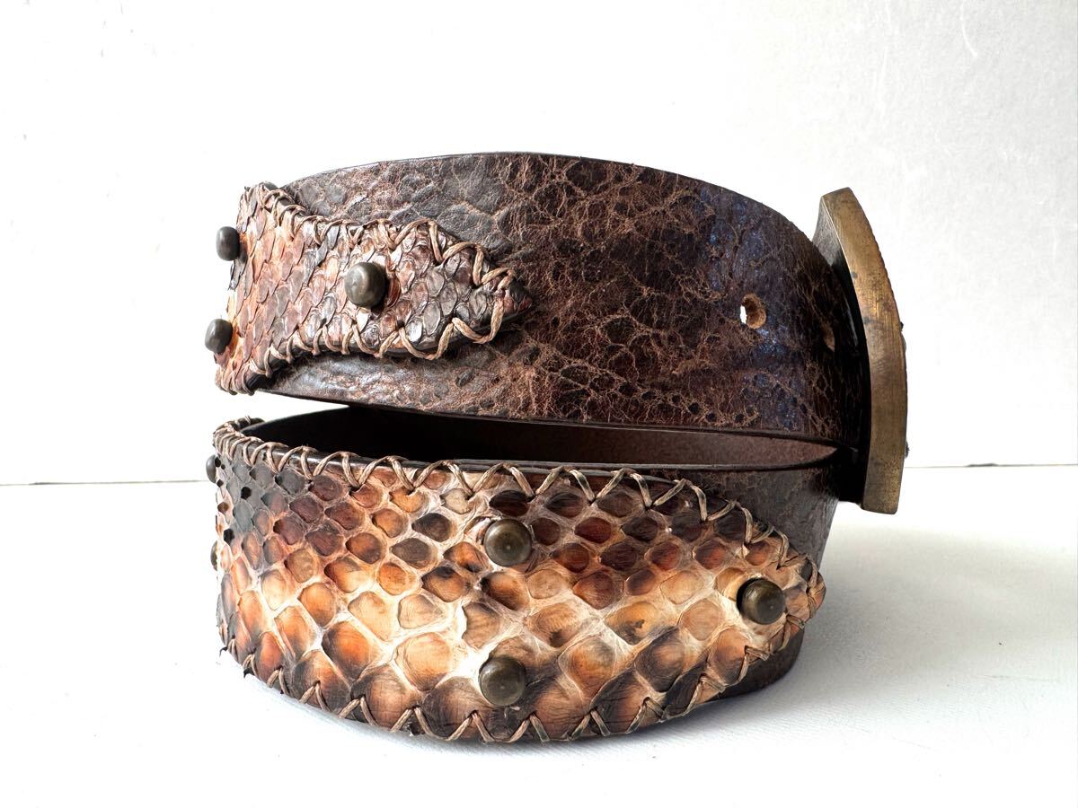 ・風合いの良いパイソンレザーとカウレザー??を使い綺麗なカッティングにビス??を使用しつなぎ合わせたデザインやステッチデザイン、バックルの装飾などが細部にまでつくり込まれておりとても手が混んだ贅沢で雰囲気抜群、お洒落なベルトになります。