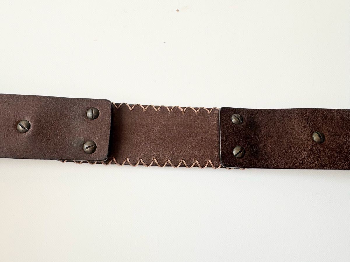 ・採寸: 全長(バックルを含まないレザー部分のみ) 95cm 穴(バックルの付いているレザーの端から穴まで) 83−80、5−78−75、5−73cm 幅 4cm バックルの長さ 7cm バックルの高さ 5、8cm