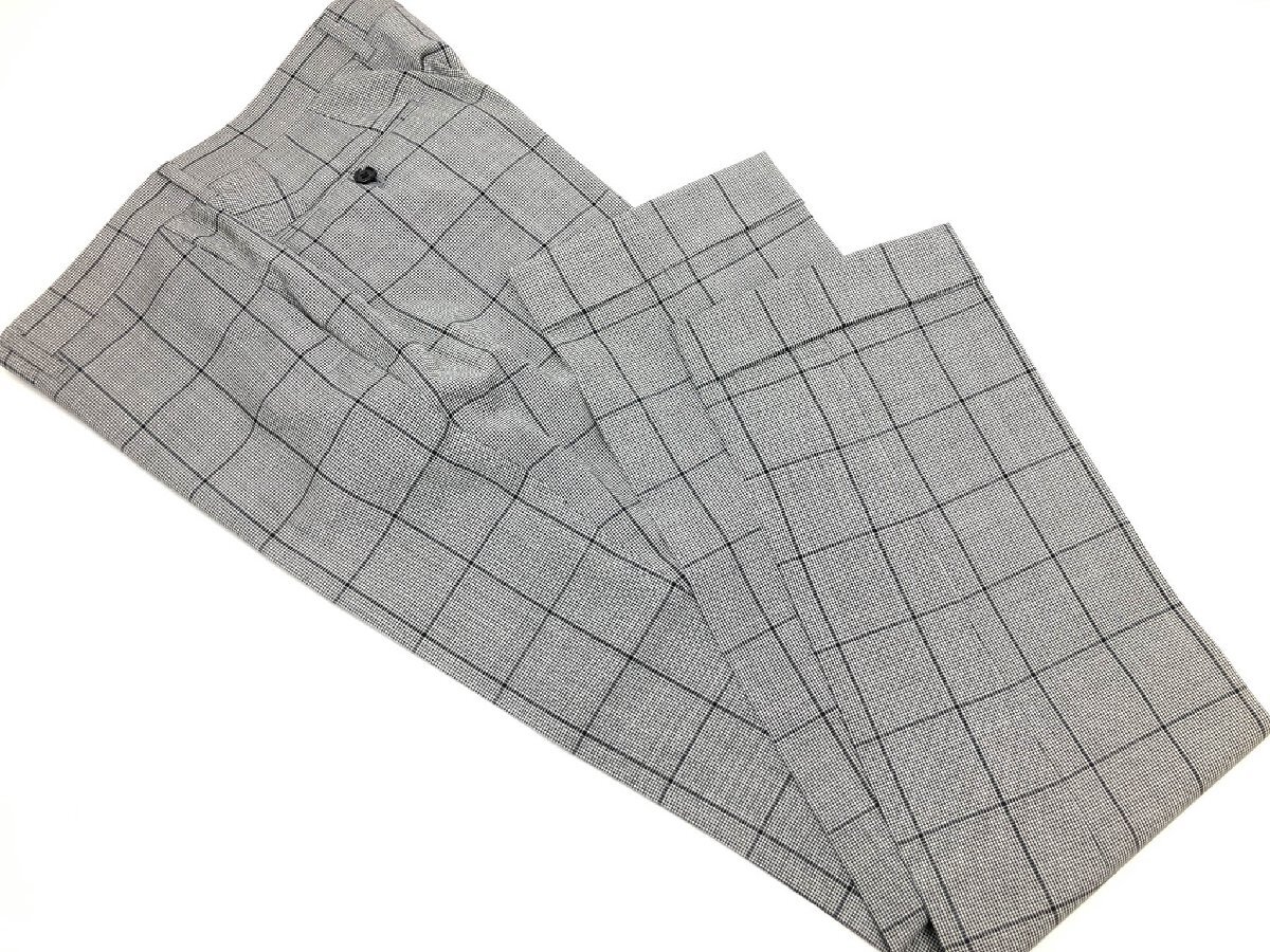・スラックス・・・ウエスト実寸約84センチ(2センチ出し、4センチ詰め可能)、股上約24センチ、渡り幅約32センチ、股下約84センチ、総丈約106センチ、裾幅約19センチ、ダブル仕上げ(ダブル幅約4.5センチ、最大でプラス7センチ長くできます)