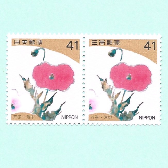 芥子◆四季の花シリーズ第1集◆中村芳中「扇面貼付屏風・紅白芥子図扇面 」より◆41円切手x横2連ペア=額面82円未使用◆1993年発行