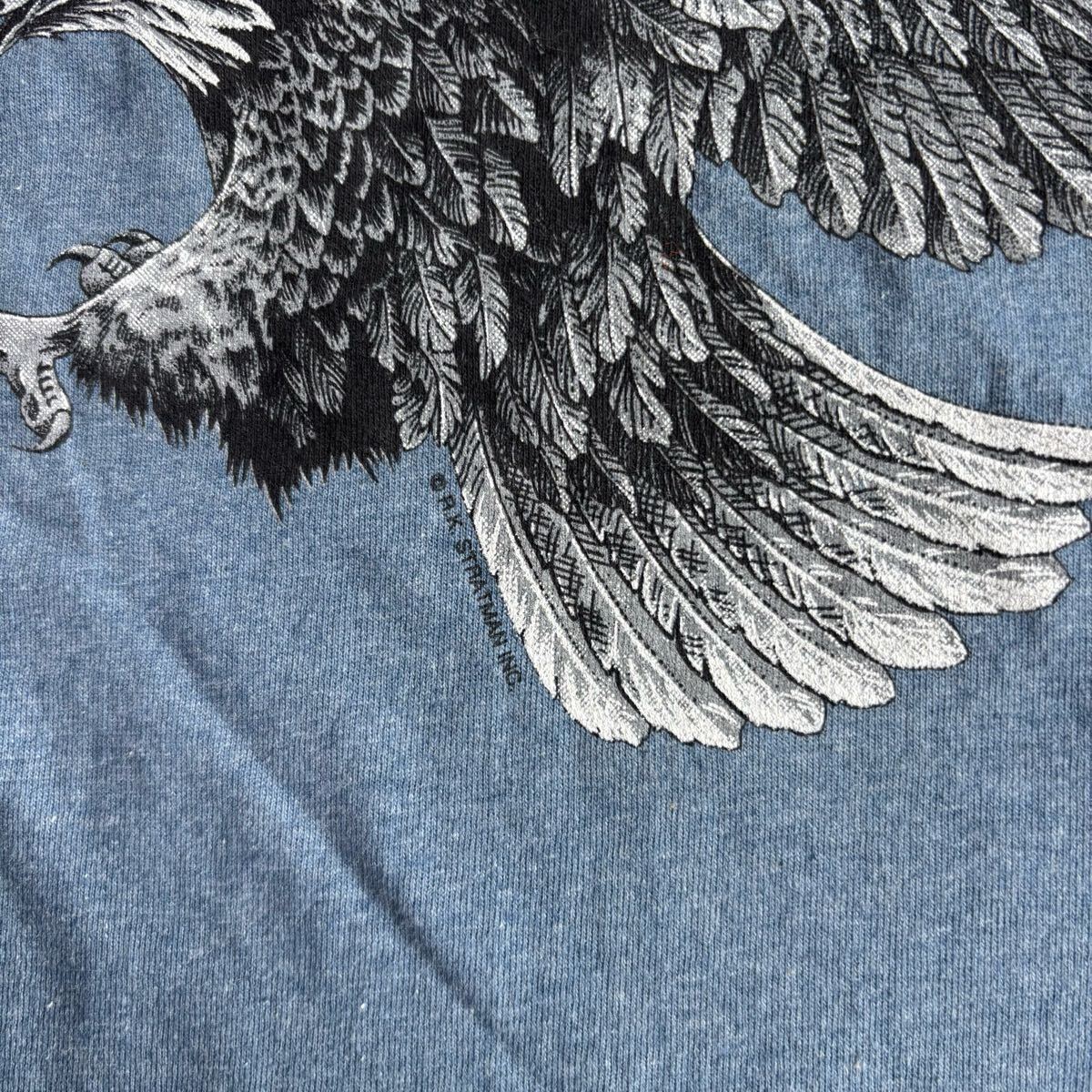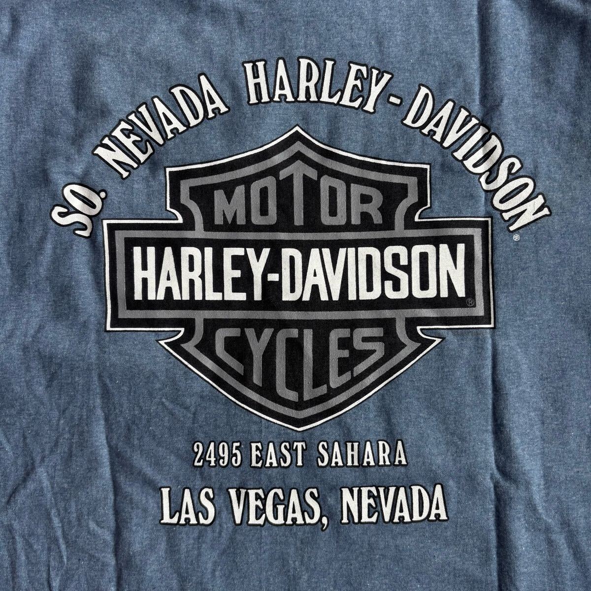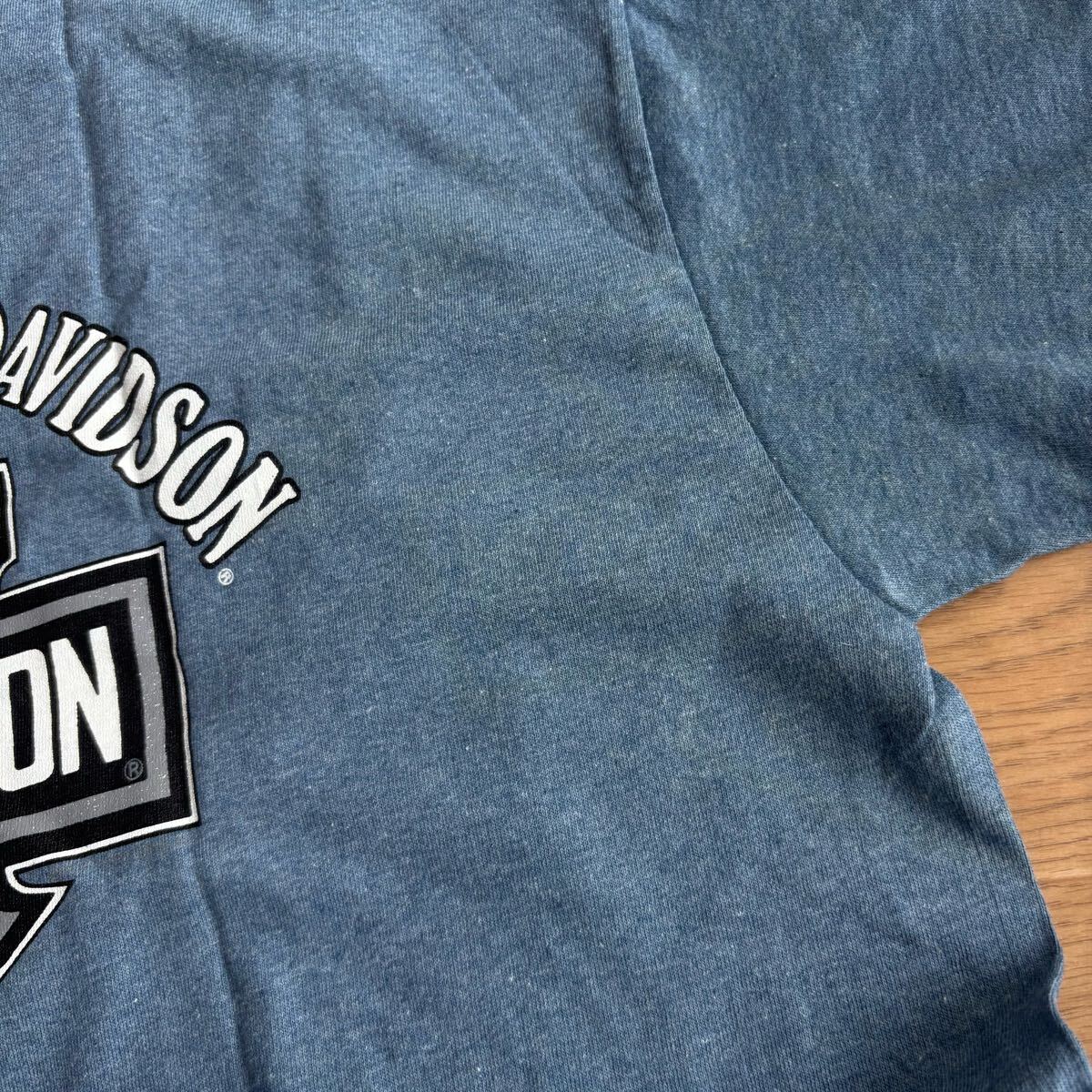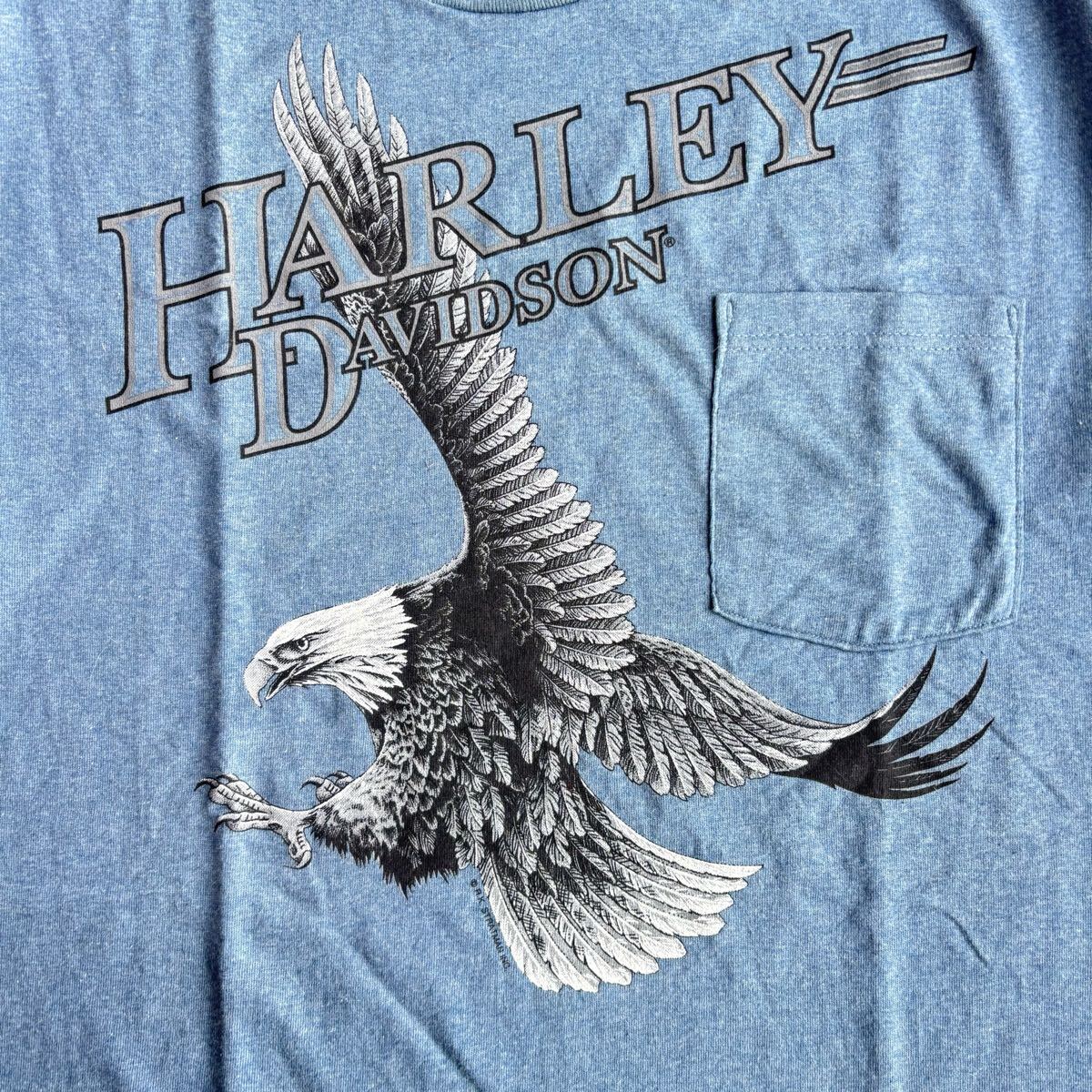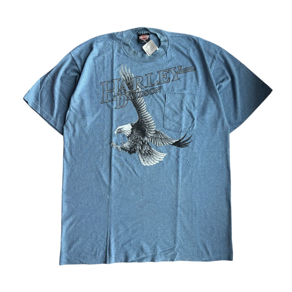 ラスベガスのディーラーアイテムと見えるこちらは、フロントには勢い良く飛び立つイーグルが描かれたハーレーらしさ溢れる一枚。フロントプリントにも関わらず、ポケットが配される仕様はこの年代ならでは。