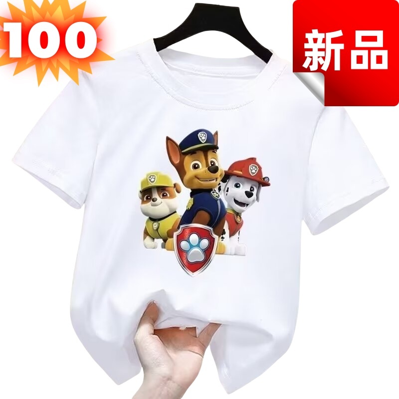 こちらは、パウパトロールがプリントされた新品の子供用Tシャツです。チェイス、マーシャル、ラブルの3匹の可愛いキャラクターと、パウパトロールの象徴である肉球マークの盾が描かれています。素材は柔らかく肌触りの良い綿素材で、お子様の敏感なお肌にも安心です。