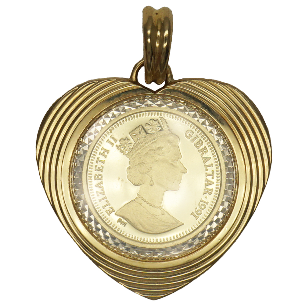 備考 | 純金のロイヤルドッグコイン(1991年)にK18素材の枠、両面にガラスカバーがついています。 枠は可愛らしいハート型です。 発行国:英領ジブラルタル 発行年:1991年 表面デザイン:ロイヤルドッグ(コーギー) 裏面デザイン:エリザベス2世 | ||||||