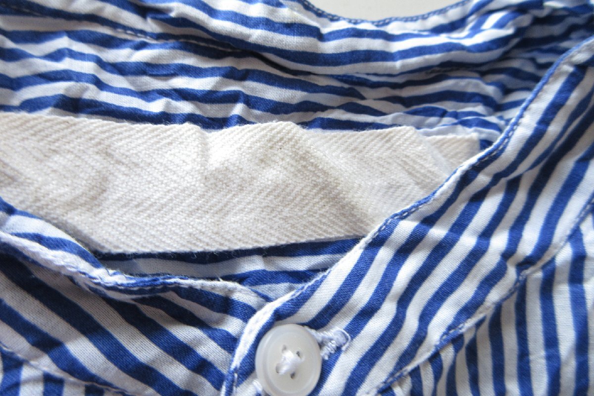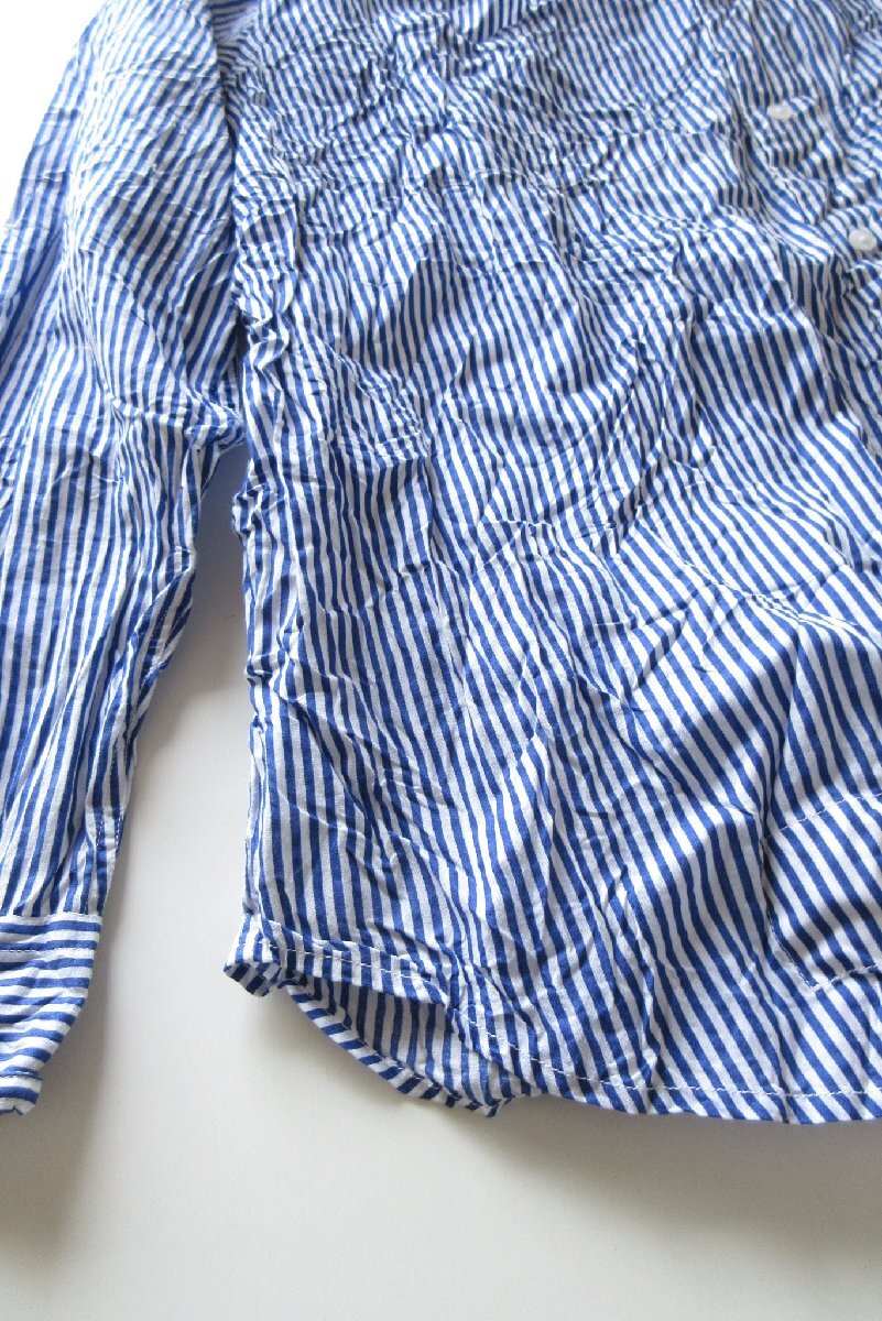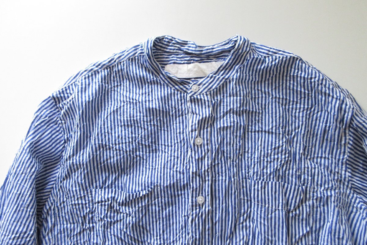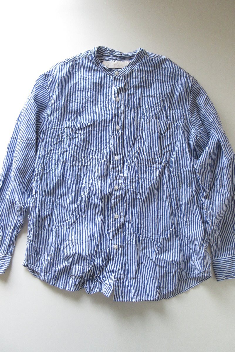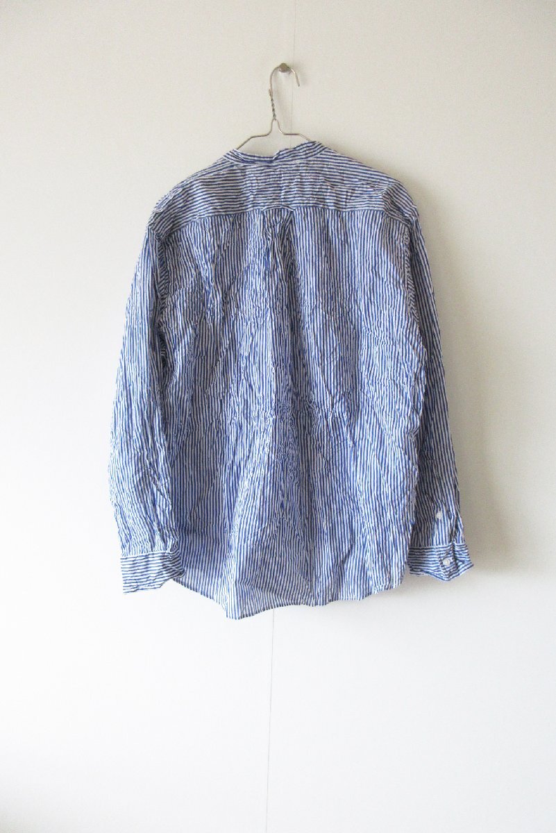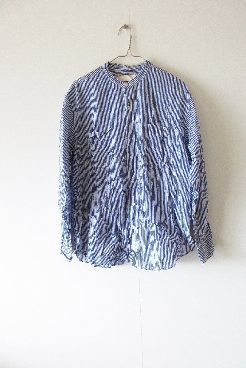 美品 Vas-y Lentement / ヴァジーラントモン シワ加工 コットンストライプバンドカラーシャツ BLUE / 長袖 ブラウス