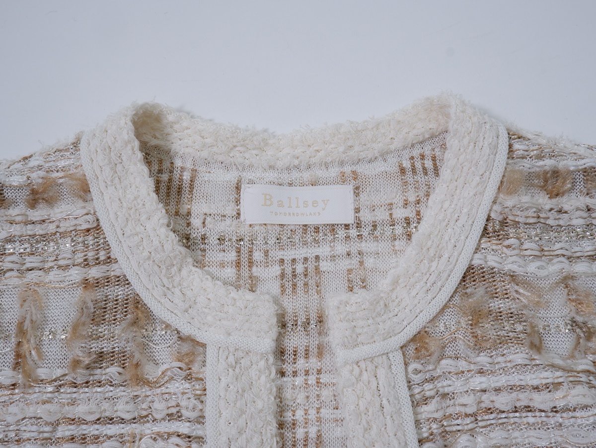 【素材感】やや薄手の生地 【透け感】あり 【裏地】なし 【ストレッチ】なし 【開閉デザイン】なし 【付属品(取り外し可)】なし 【商品情報】イタリアの意匠糸を使用して編み上げたジャケットライクなニットカーディガン。6種類の糸を使用し、〈Ballsey〉のオリジナルで色を組んでいます。特殊な編み方をしており、布帛のような見え方とシャギー感のある立体的な編地が特徴。ボクシーなシルエットにショート丈のバランスでトレンド感溢れる一着に仕上げました。襟ぐりや前立て、ポケット口のパイピングディテールでほど良くアクセントをつけています。ハイウエストパンツやロングスカートなどのボリュームのあるボトムスとも相性が抜群。ライトなジャケット感覚で羽織っていただける、幅広いスタリングをお楽しみいただけるアイテムです。 |