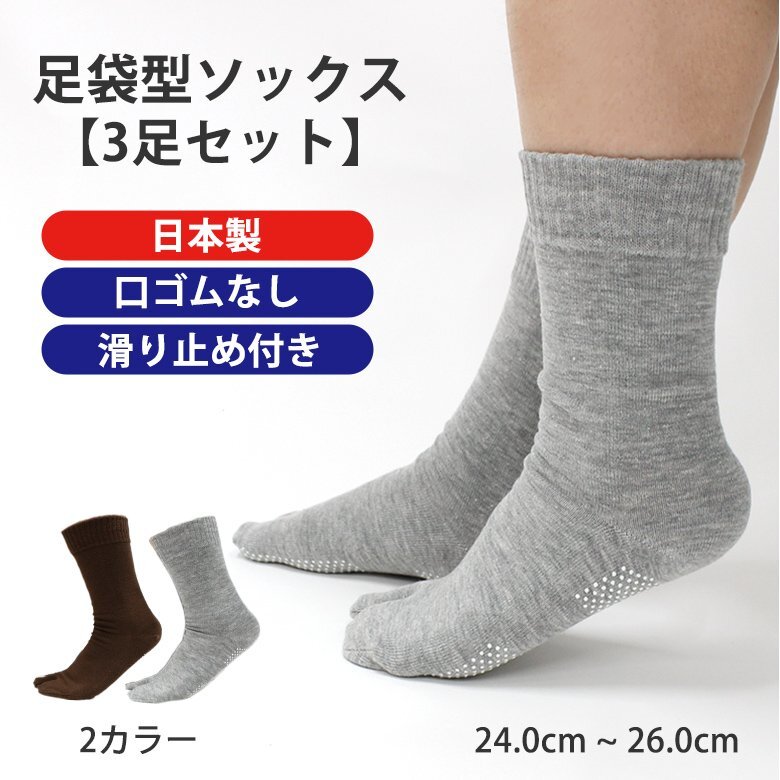 【商品名】日本製 タビ型ゴムなし すべり止めソックス 【 グレー/3足セット】