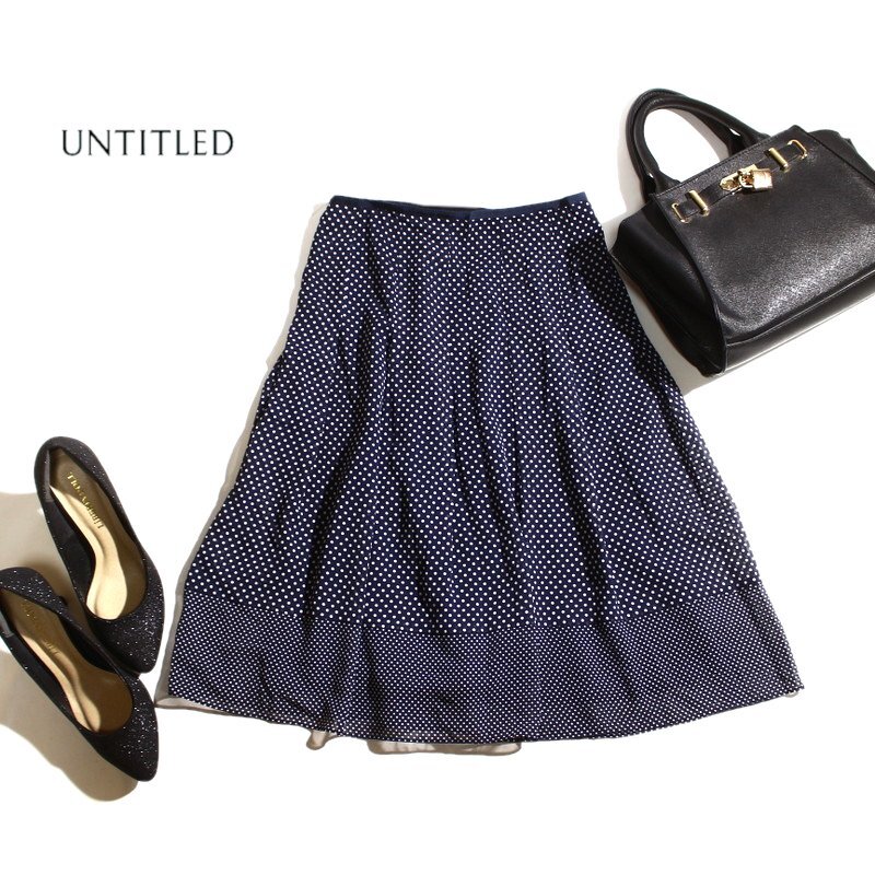 美品 アンタイトル UNTITLED 株)ワールド 春 夏 ドット 柄 プリント シフォンスカート フレアスカート 1 ネイビー 紺 ホワイト S 日本製