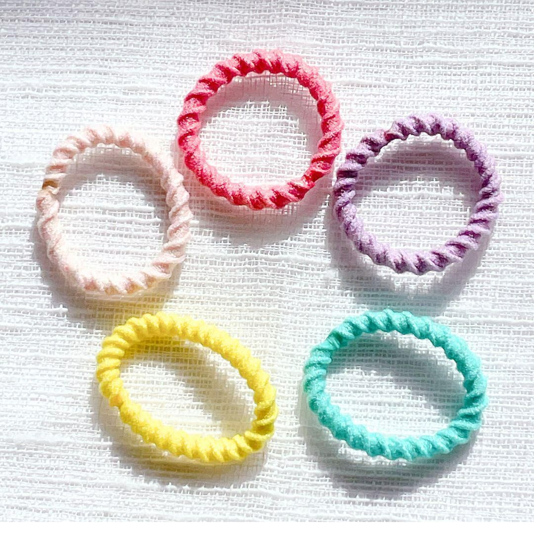 直径が約2cmで0歳児から3歳くらいまでのベビー・幼児や薄毛ちゃん、ヘアアレンジ用にそれ以外の年齢のお子様にもおすすめなヘアゴムです。