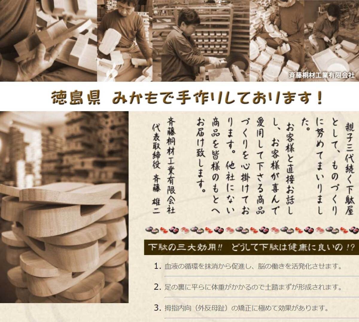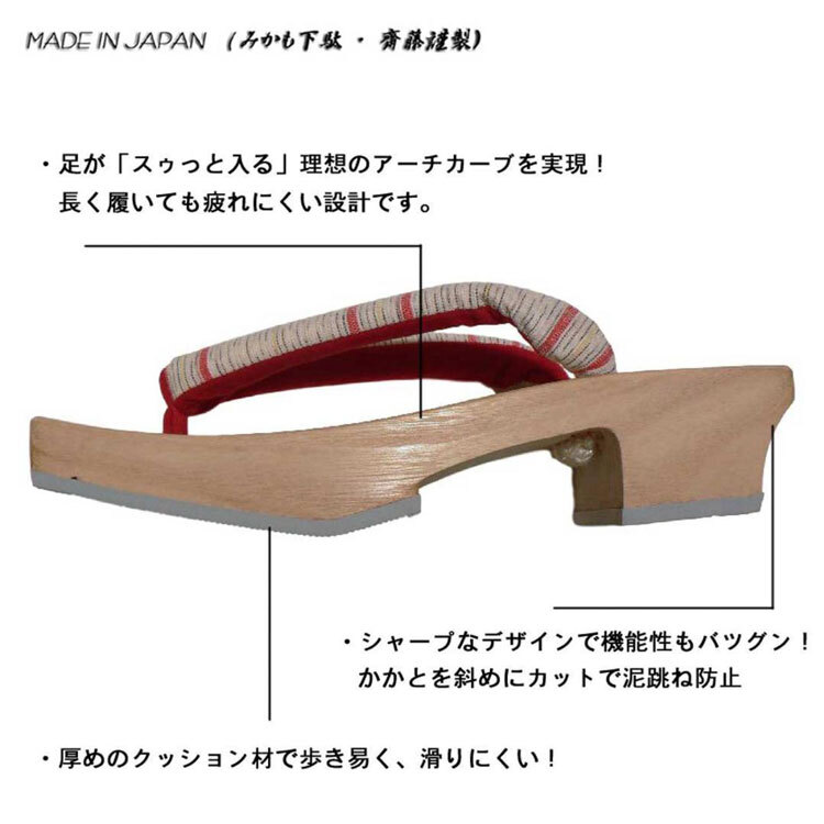 フリーサイズ 長さ約 24cm 巾 8.5cm 高さ 5.0cm ※現品です、即日発送可能です。 阿波の桐下駄、徳島県地場工芸品の桐下駄です。 半端ないフィット感をご堪能ください。 シャープなデザインかつ機能的な女下駄です。 台の角度が計算されて作られているため、台はきれいな流線を描いていて足にスッと馴染みます。 かかと部分は泥跳ね防止のために斜めにカットされています。 底裏地はクッション材を使用し衝撃吸収、吸音性に優れ足が疲れにくい構造になっています。 「粋創楽舞」オリジナル下駄 徳島・みかも下駄、斉藤桐材工業謹製 (親子3代続く下駄工房) | |