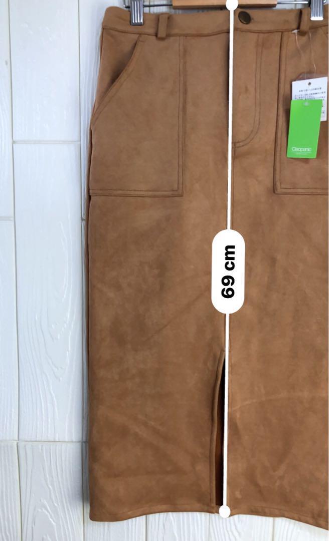 ブラウンのタイトスカート、ウエスト64cm、丈69cmのスタイリッシュなデザイン。