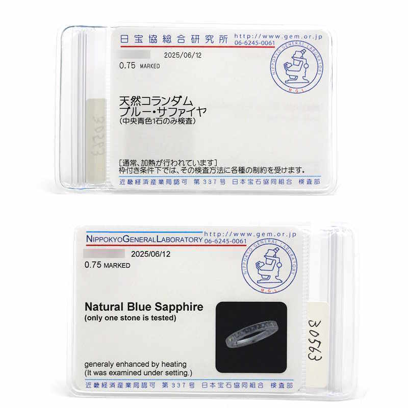 ソーティング記載 | 天然コランダム ブルー・サファイヤ (中央青色1石のみ検査) 通常、加熱が行われています |