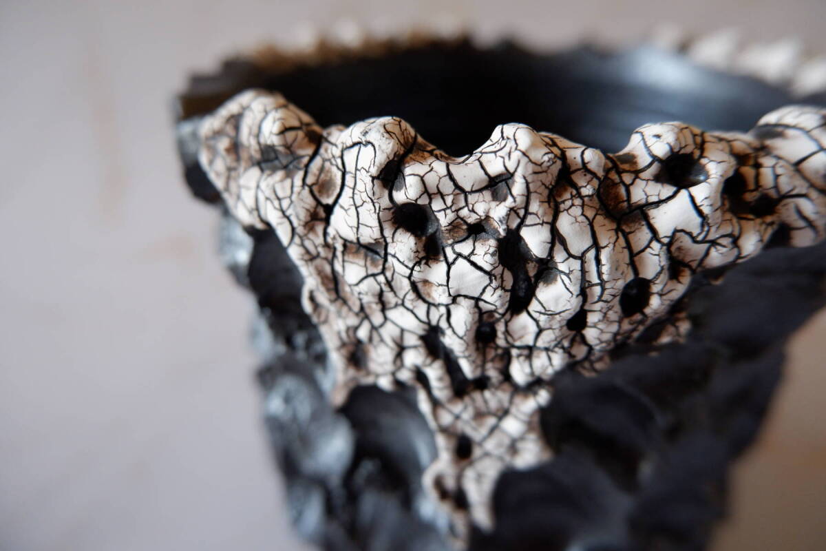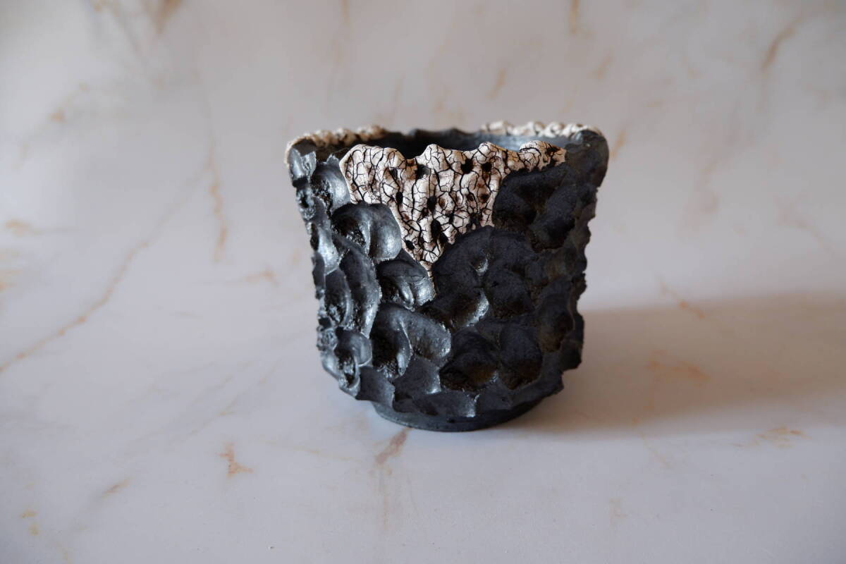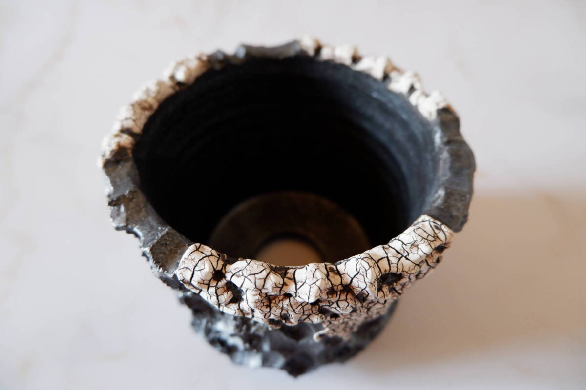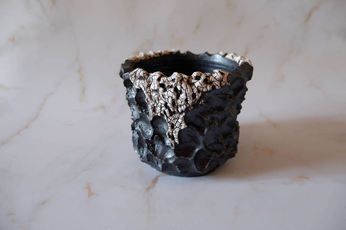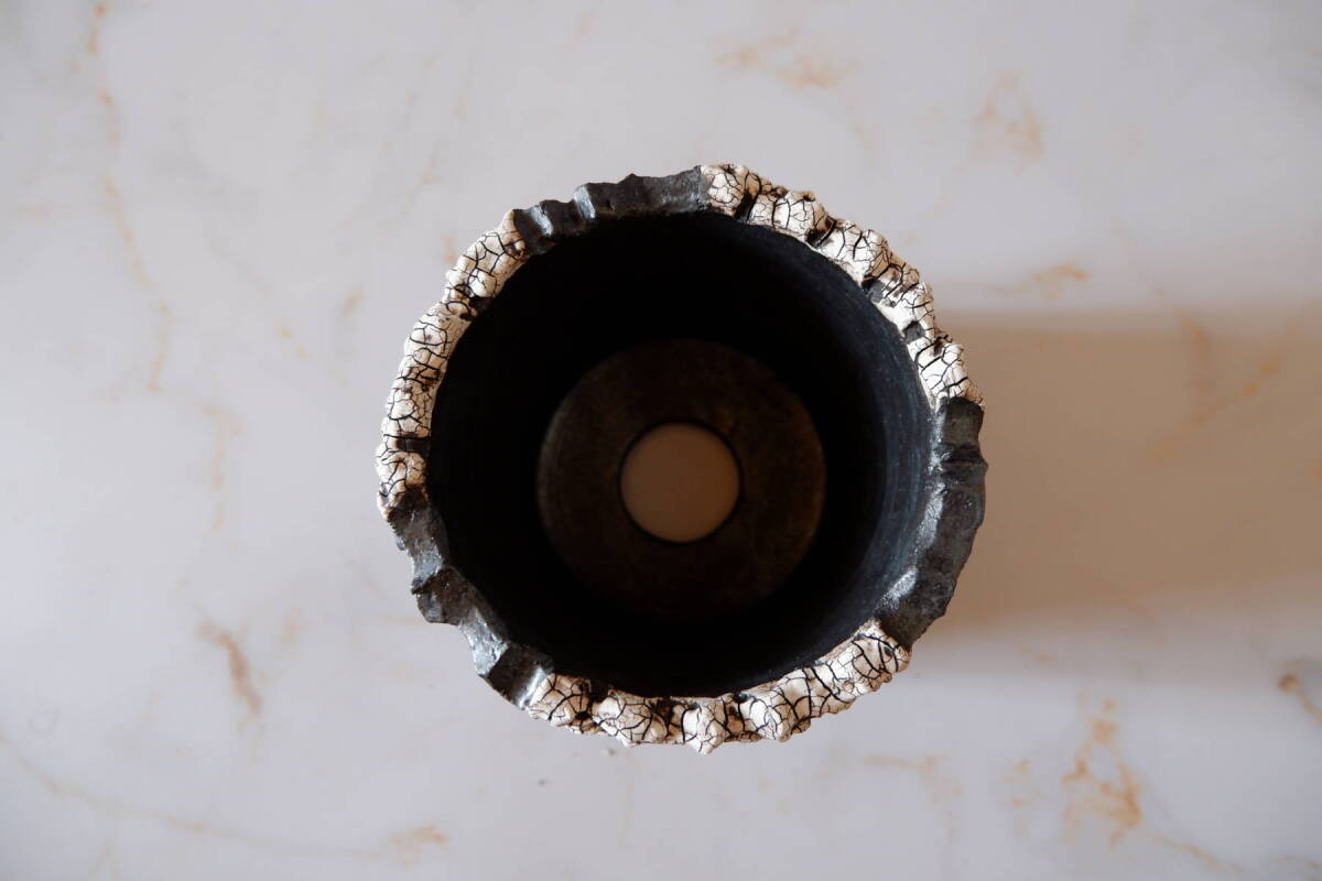 艶を抑えた黒釉を全体に掛け、白化粧土が顔を出すようその部分だけ一度拭き取りましたので、ひび割れ模様がより鮮明に現れています。