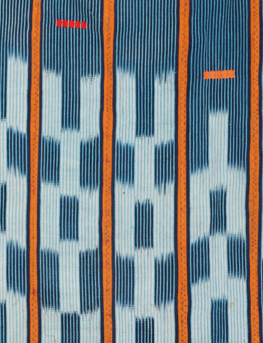 藍染めの糸をベースに、オレンジやピンク、グリーン、イエローなどのカラフルな糸を用いて織り上げられた、美しい色彩とリズム感のある伝統布。