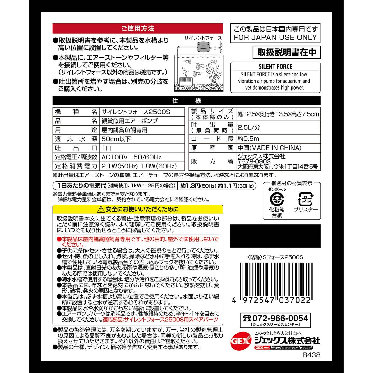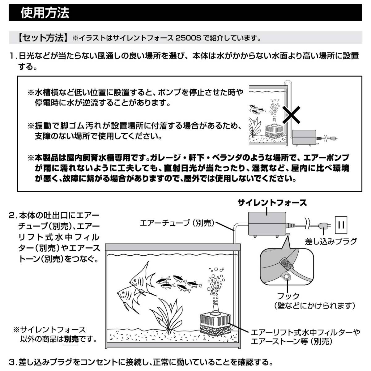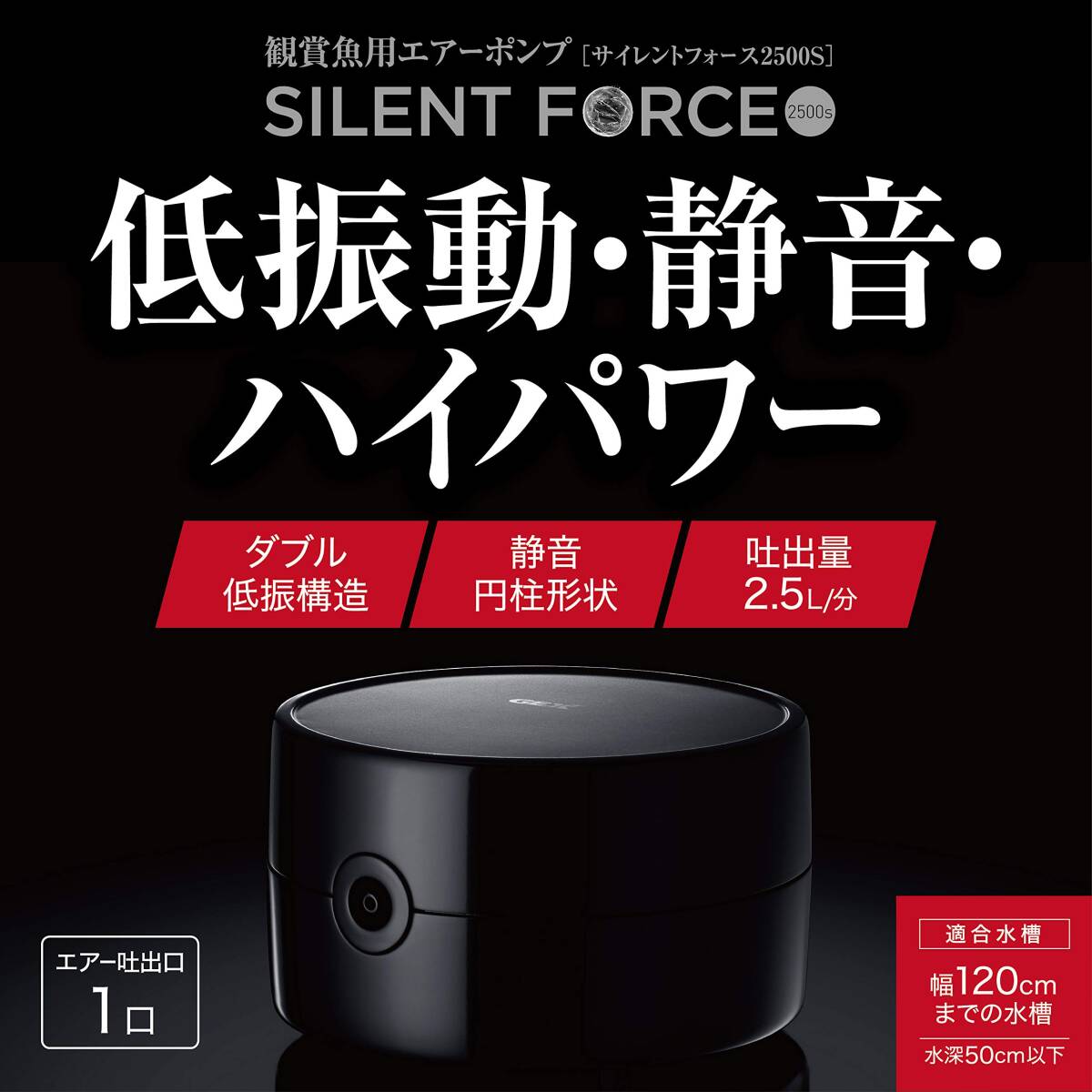 商品紹介低振動・静音かつハイパワーを両立!屋内観賞魚飼育水槽専用エアーポンプです。 <2つの低振構造> 1.2つのダイヤフラム駆動により、振動を打ち消しあうことで低振動を実現。(振動約70%ダウン ※従来品比 ジェックス調べ) 2.振動を吸収する防振脚ゴム使用。 <2つの静音構造> 1.円柱形状で通気距離を長くすることで静音化を実現 騒音約20%ダウン。(※従来品比 ジェックス調べ) 2.3つのエアーフィルターで騒音を低減。使用上の注意※本製品は屋内観賞魚飼育専用です。他の目的、屋外では使用しないでください。※子供に操作・セットさせる場合は、大人の監視のもとで行ってください。※セット時、魚の出し入れ、点検、掃除など水中に手を入れる時は、必ず水槽で使用している電気製品全ての差し込みプラグを抜いてください。※本製品は、直射日光のあたる所や湿気・ほこりの多い所、油煙や湯気の当たる所では使用しないでください。※海水水槽で使用する場合は、塩分や汚れをこまめに拭き取ってください。※本製品は、必ず水槽より高い位置でご使用ください。水面より低い場所に設置すると水が逆流する恐れがあります。※本製品は水や水滴がかからない場所に設置してください。※エアーポンプパーツは消耗品です。性能維持のため、半年~1年を目安に交換してください。適応部品:サイレントフォース2500S用スペアパーツ原材料・成分ABS他使用方法・取扱説明書を参考に、本製品を水槽より高い位置に設置してください。 ・本製品に、エアーストーンやフィルター等を接続してご使用ください。(サイレントフォース以外の商品は別売です。) ・吐出箇所を増やす場合は、別売の分岐をご購入ください。ご注意(免責)>必ずお読みください※製品の仕様、デザイン、価格等予告なく変更することがあります。