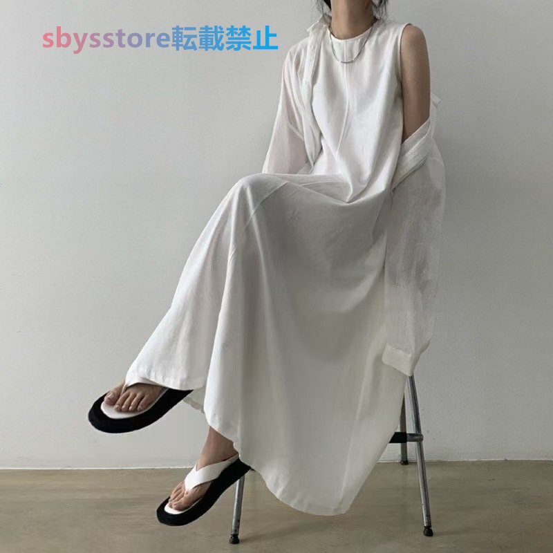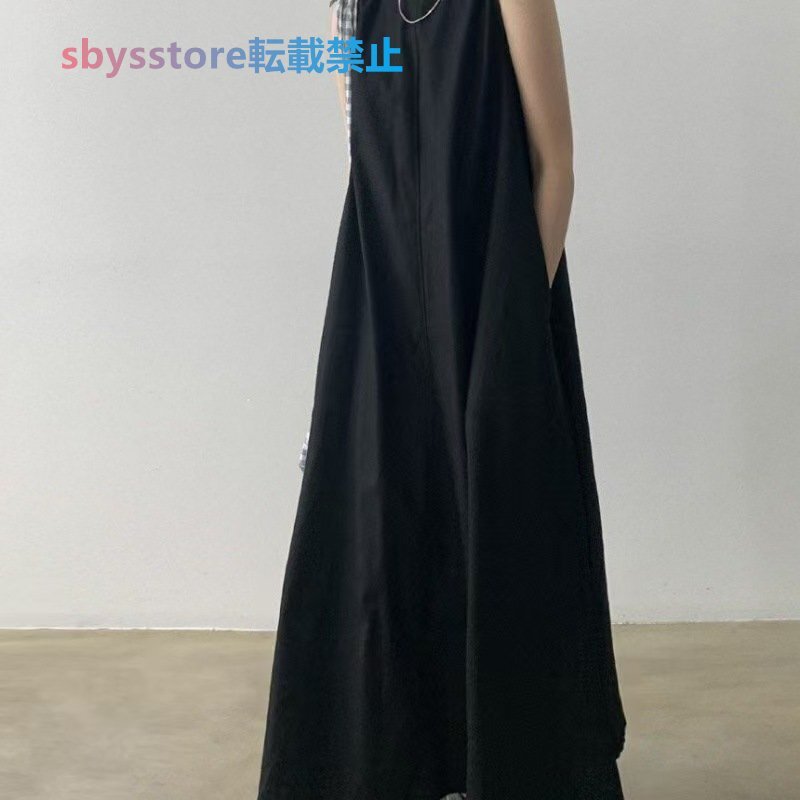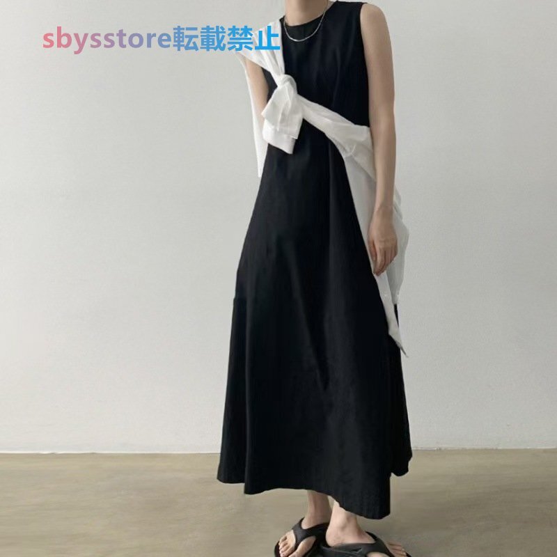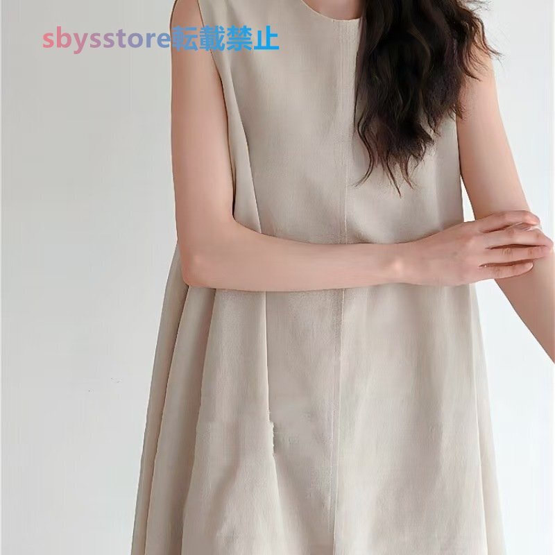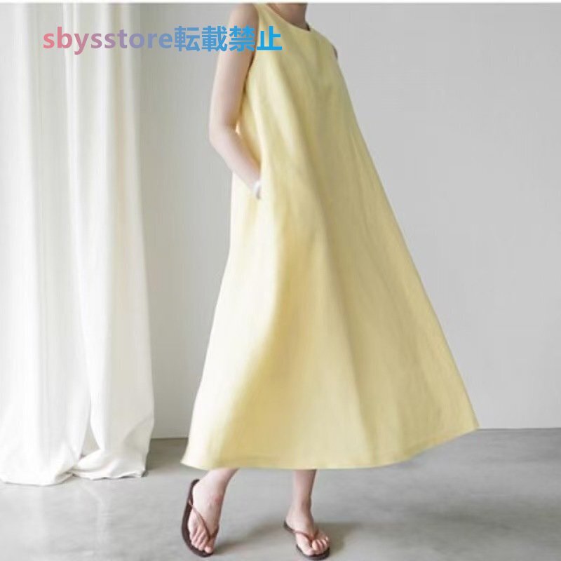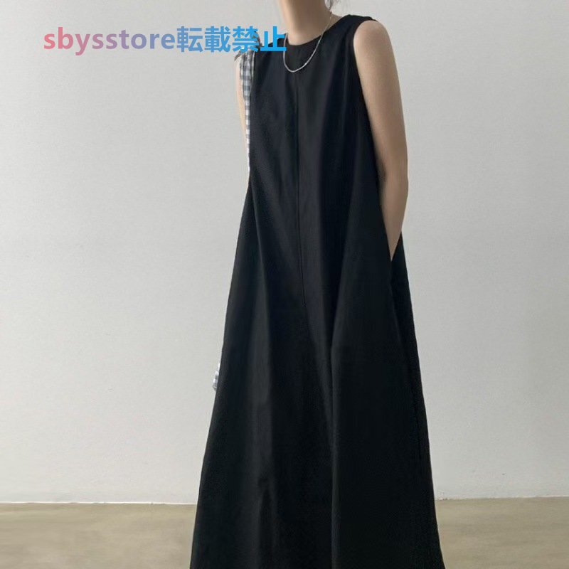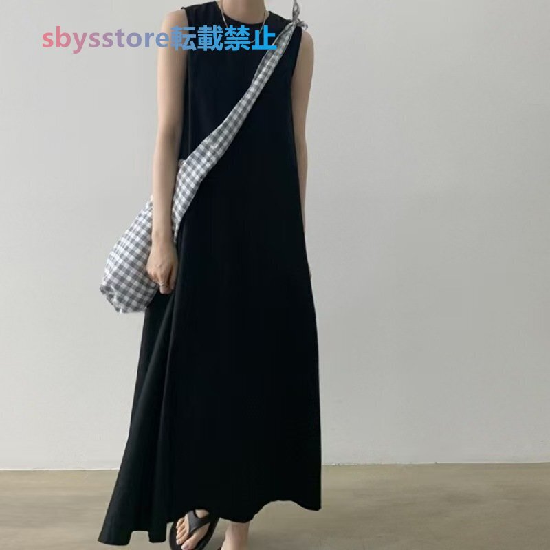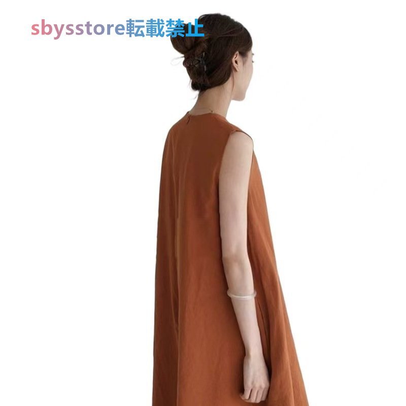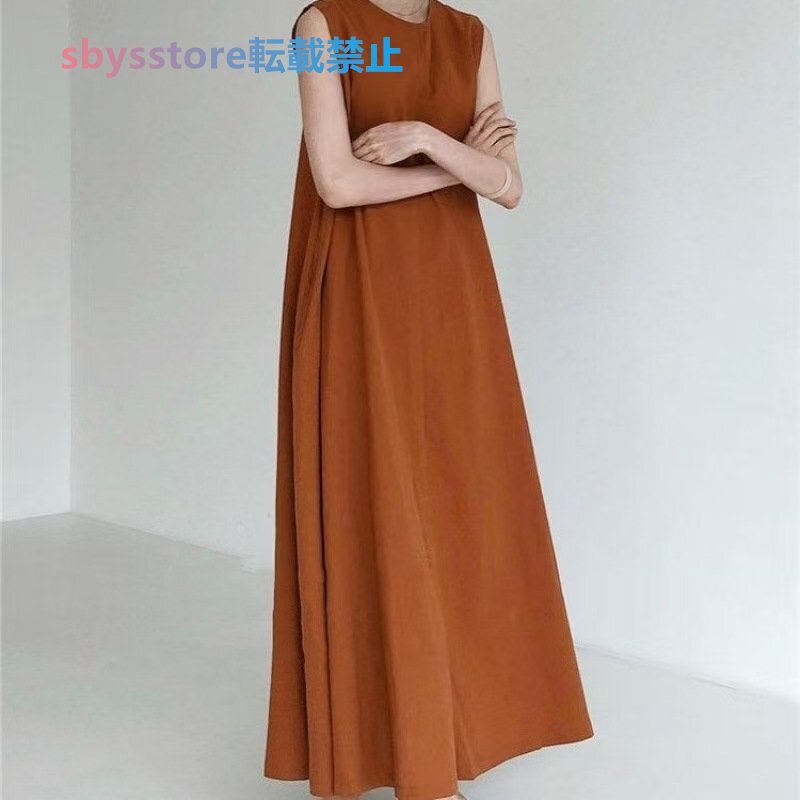 夏物 レディースワンピース カジュアル 無地ライン 袖なしマキシロングワンピース ブラウン