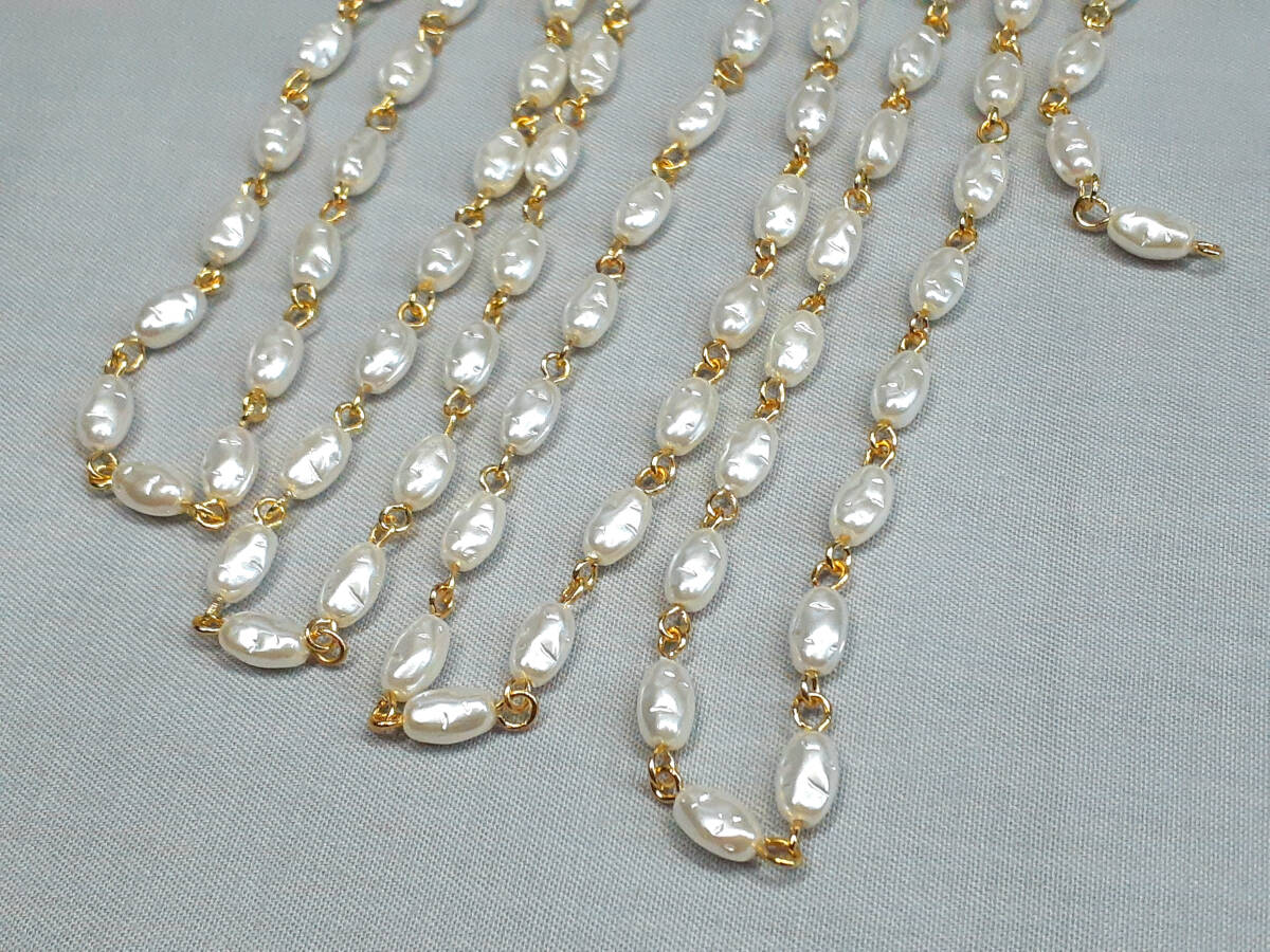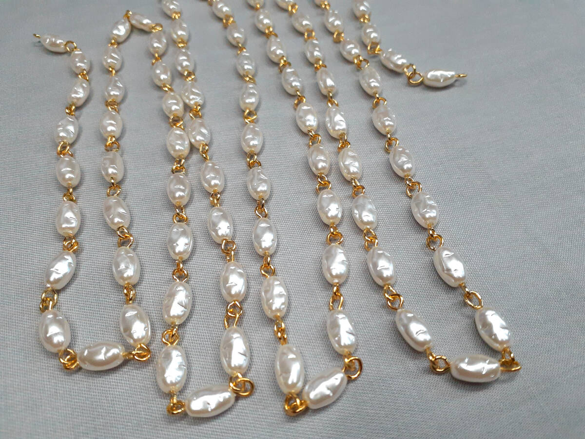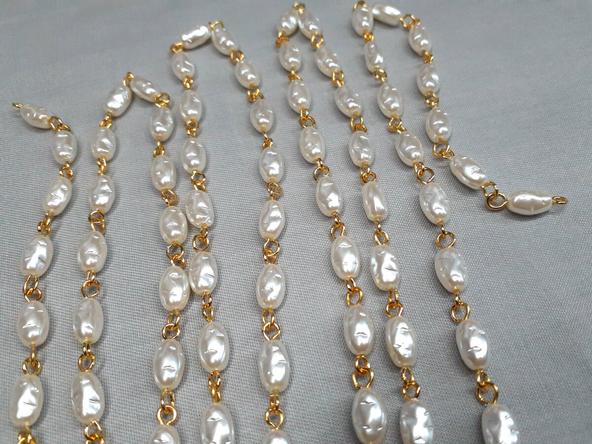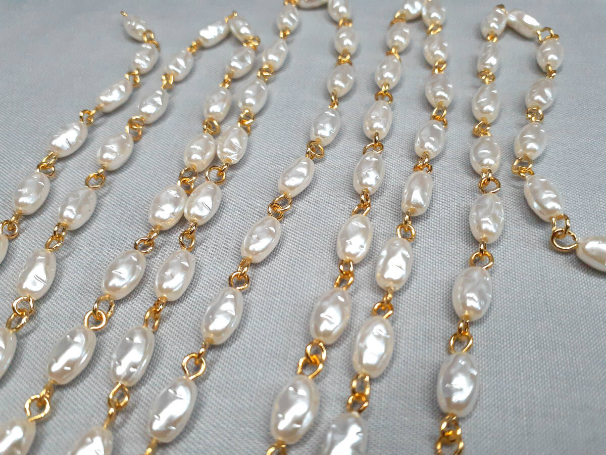 商品の ご説明 5×7,5 mm ピン曲げ 加工品 変型 ナツメ鬼 白パール 全長 1m です。 ピンは真鍮ゴールドメッキ です。 | ||