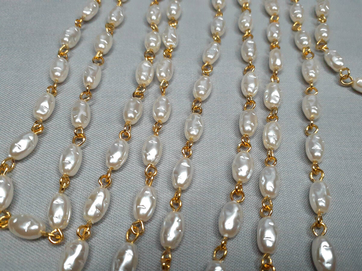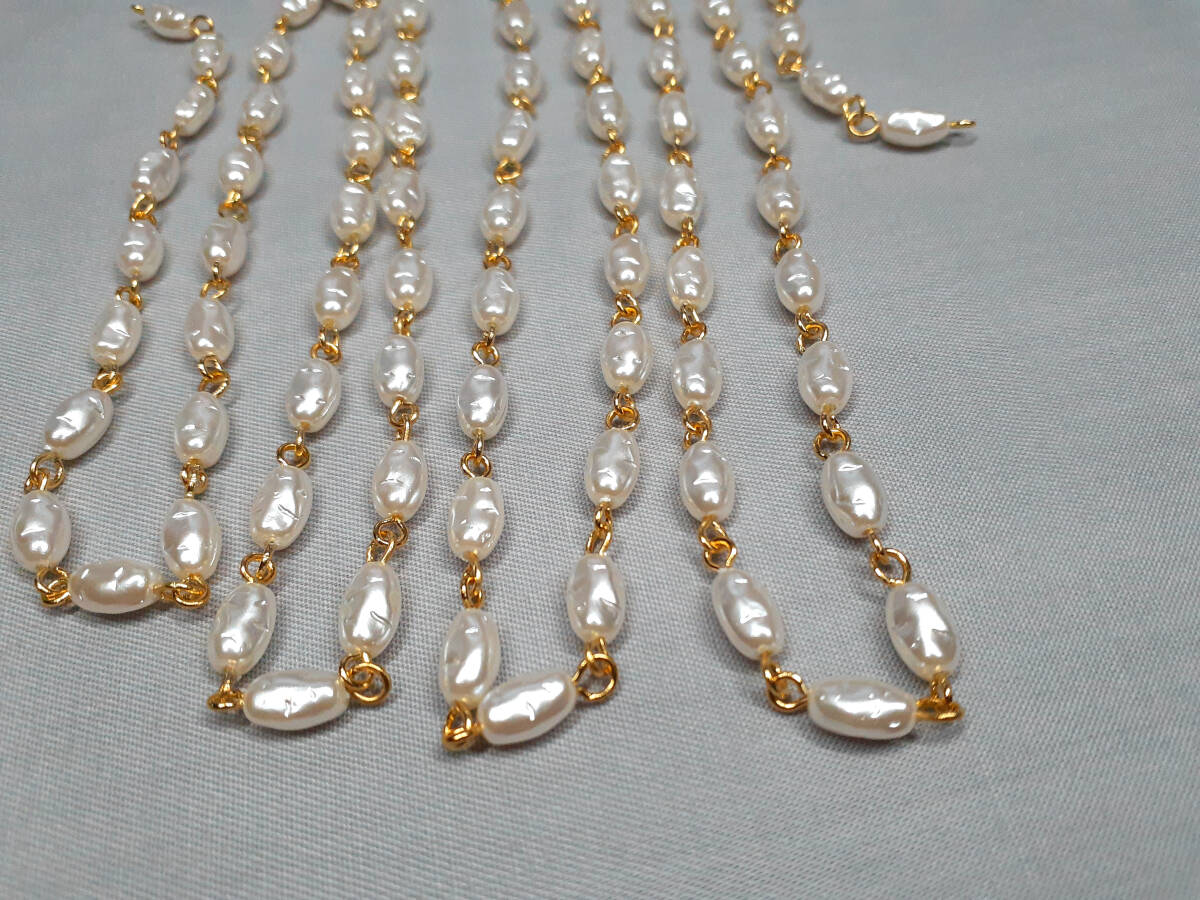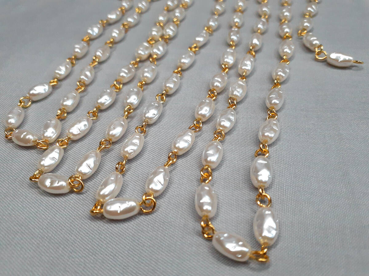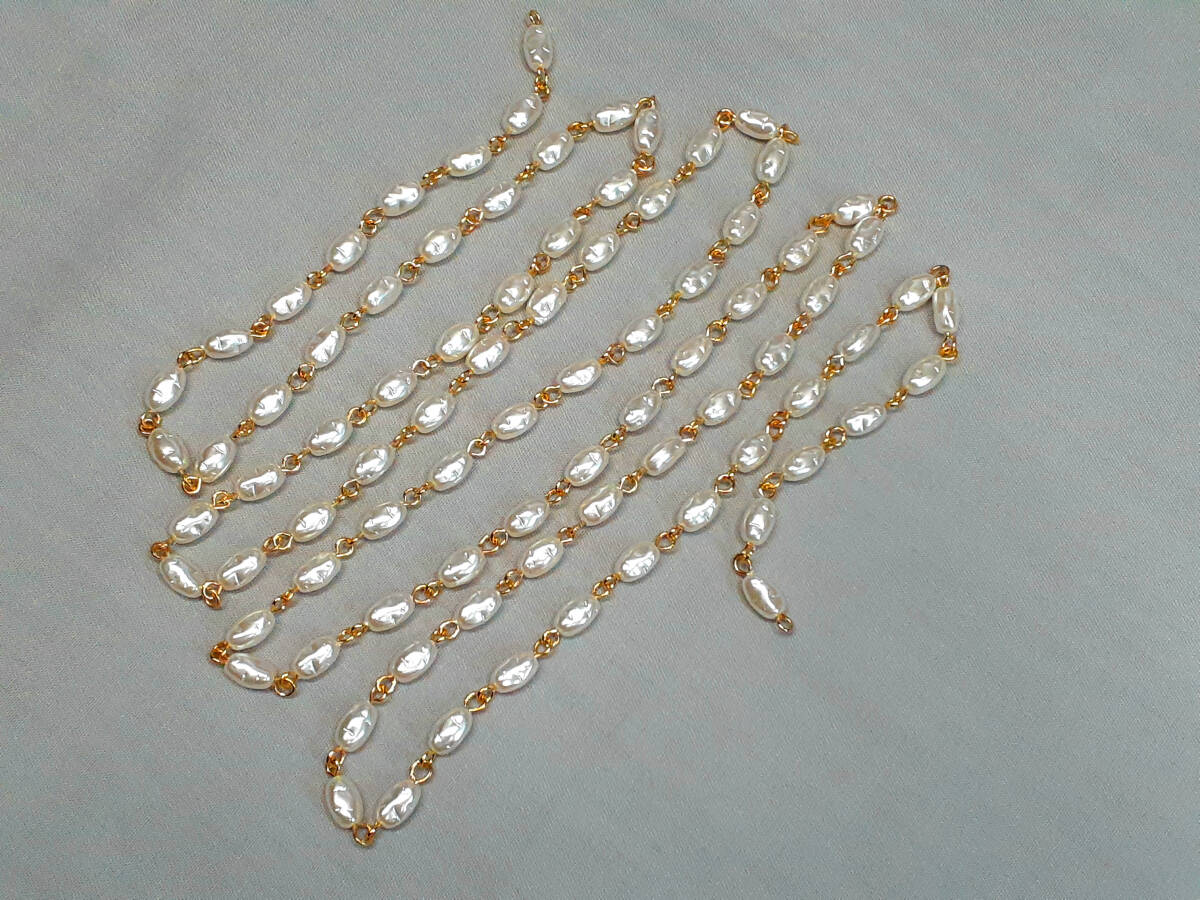 商品の ご説明 5×7,5 mm ピン曲げ 加工品 変型 ナツメ鬼 白パール 全長 1m です。 ピンは真鍮ゴールドメッキ です。 | ||