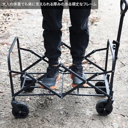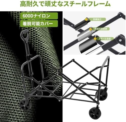【100kg耐荷重&全天候対応フレーム】 防錆スチール骨組みと耐撕裂600D防水ナイロンで、砂浜・草地・雨の舗装路でも安定走行。