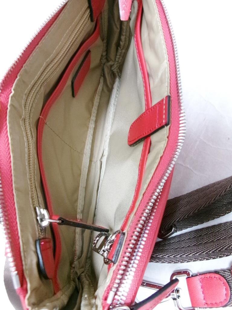 【デザイン】 レザー。ファスナー開閉。背面ポケット1個あり。内ポケット多数。ショルダーストラップ長さ調節可・取り外し可
