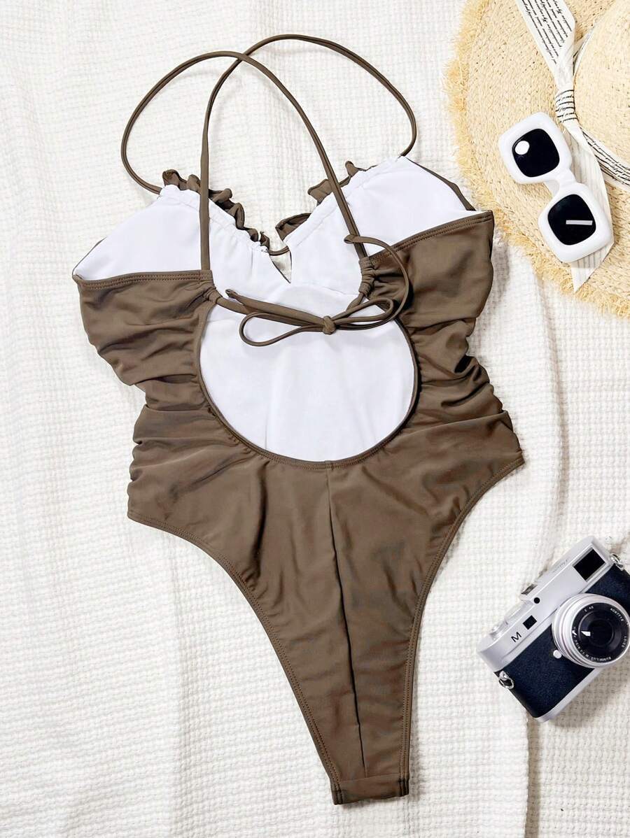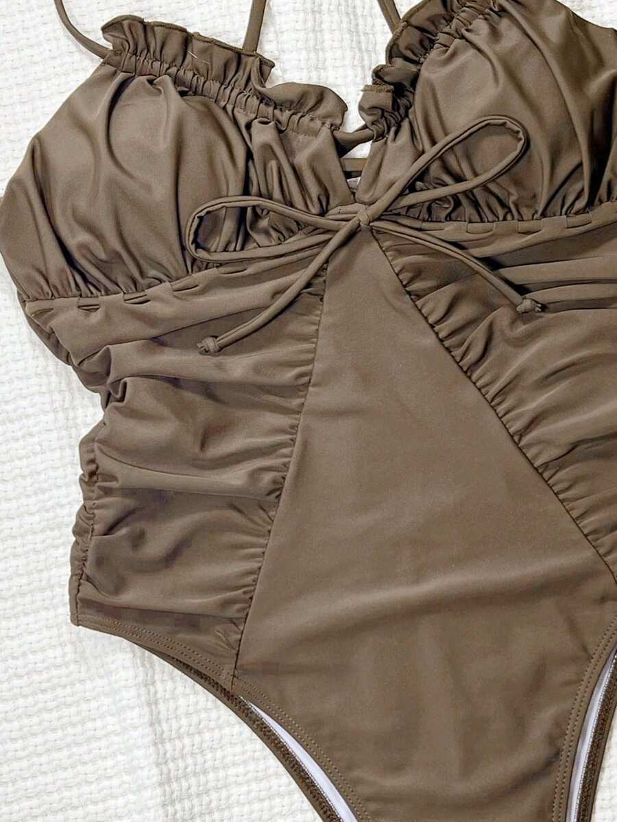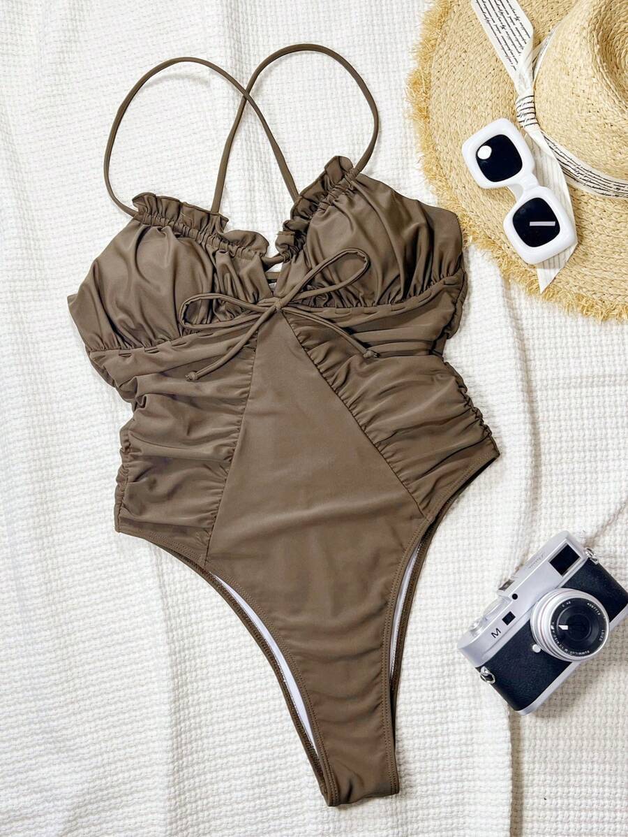 レディース 水着 ワンピース 女性夏カジュアルビーチ ドローストリング フロントギャザー ホールアウト リボンデザイン ラッフルヘ