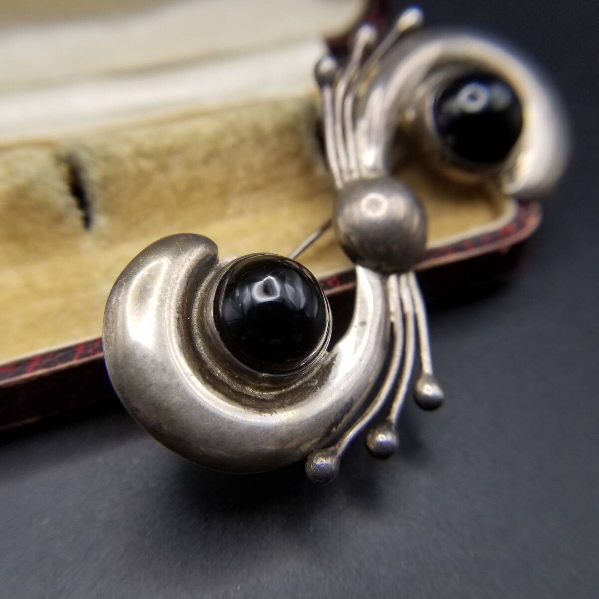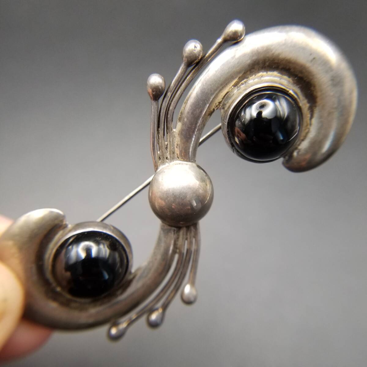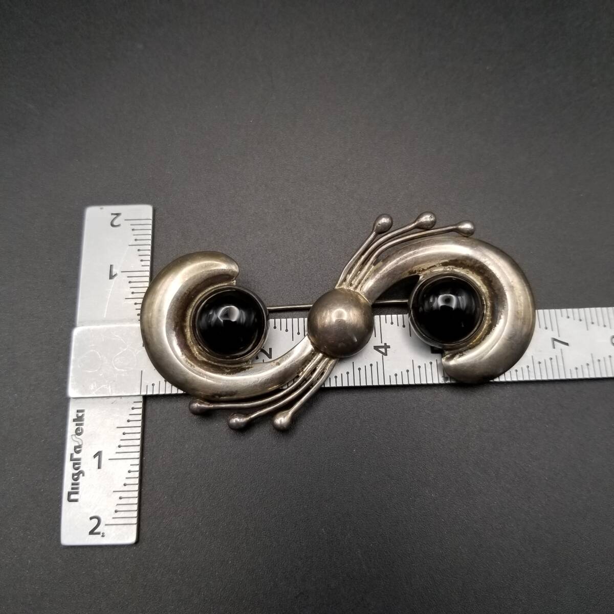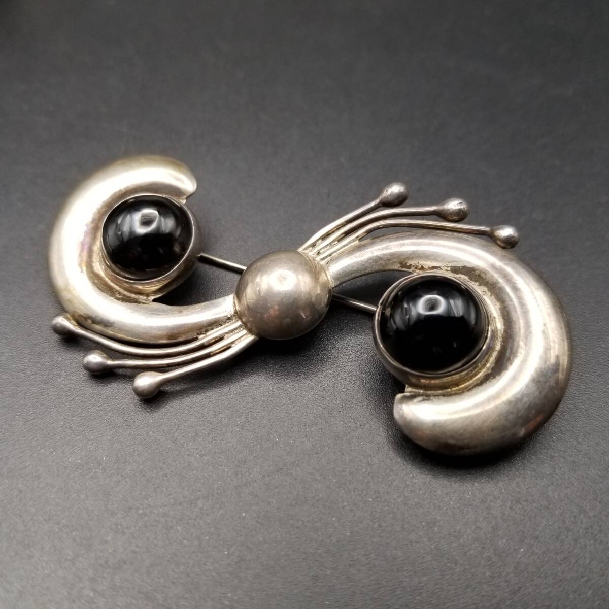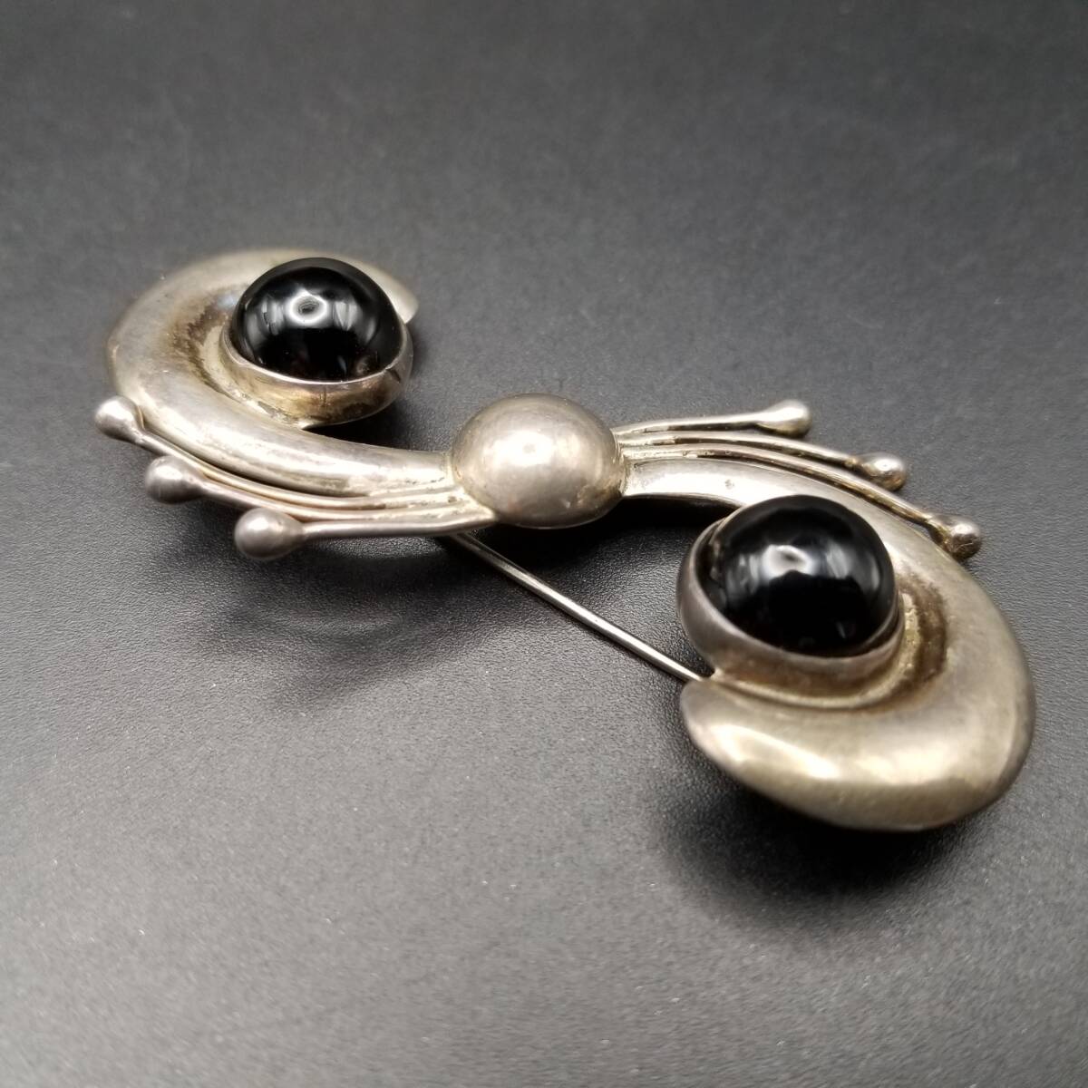 メキシコ 925 シルバー リボンデザイン オニキス カボション ヴィンテージ ブローチ 銀 モダニスト Mexico 存在感 R16-A