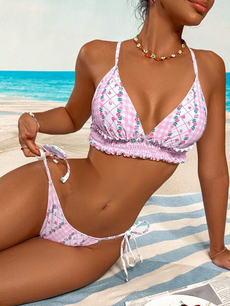 レディース 水着 ビキニセット 2点入り かわいい女の子 夏のビーチファッション スリムストラップ フローラル柄 トライアングルビ