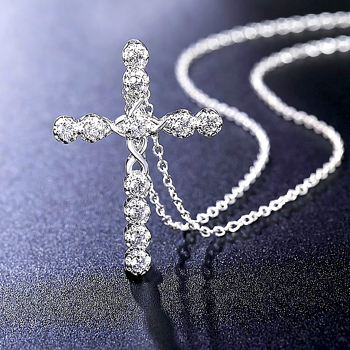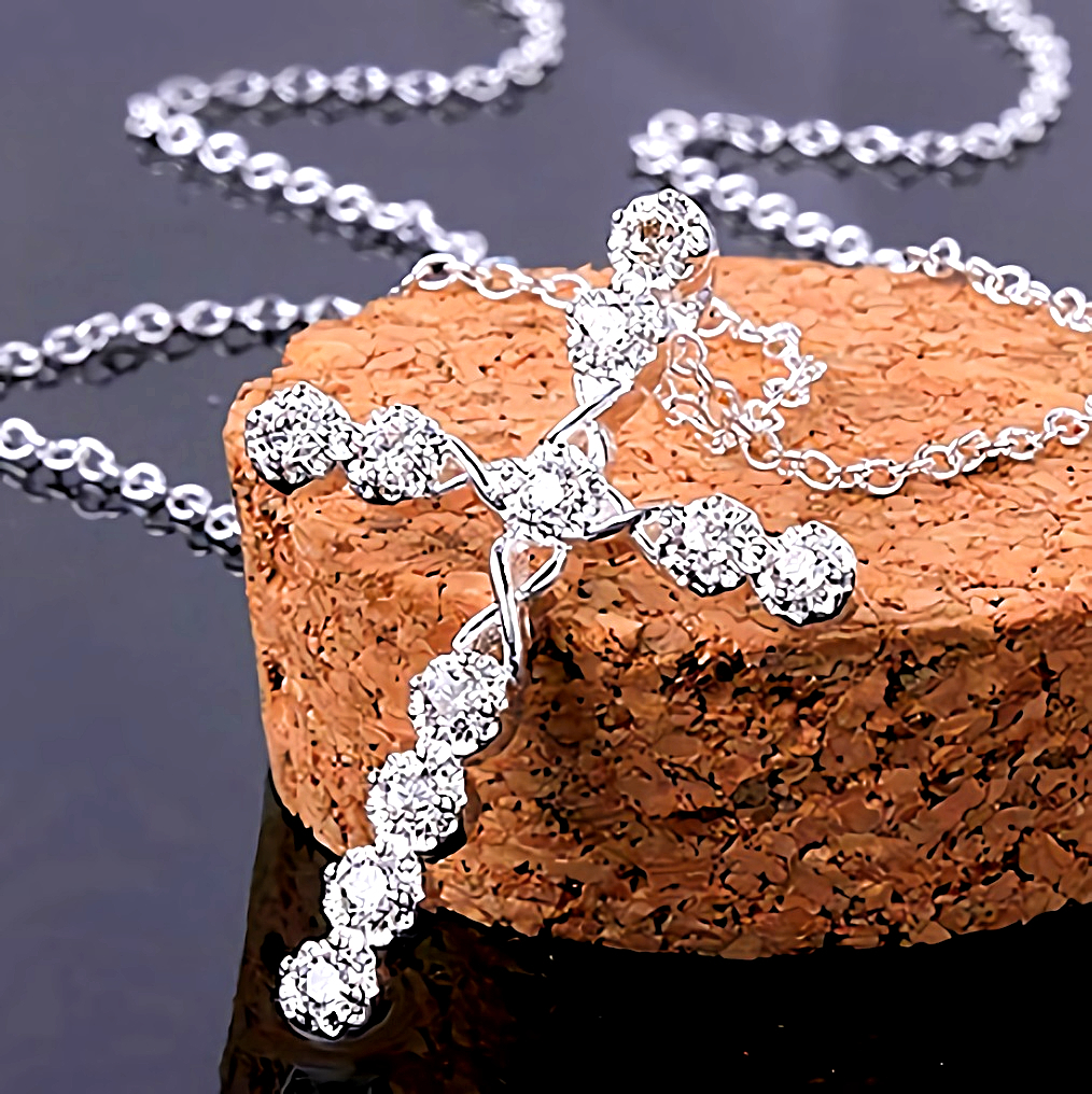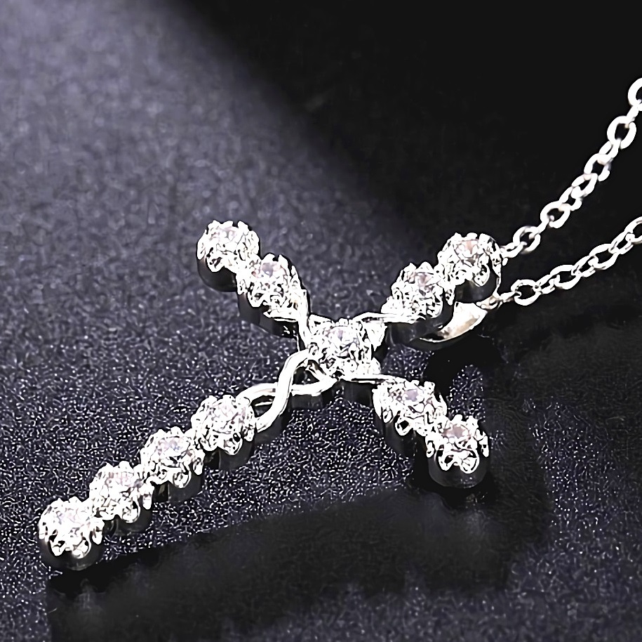 七色に輝くダイヤモンド11石のクロス十字架プラチナ仕上げ925シルバーネックレスです。