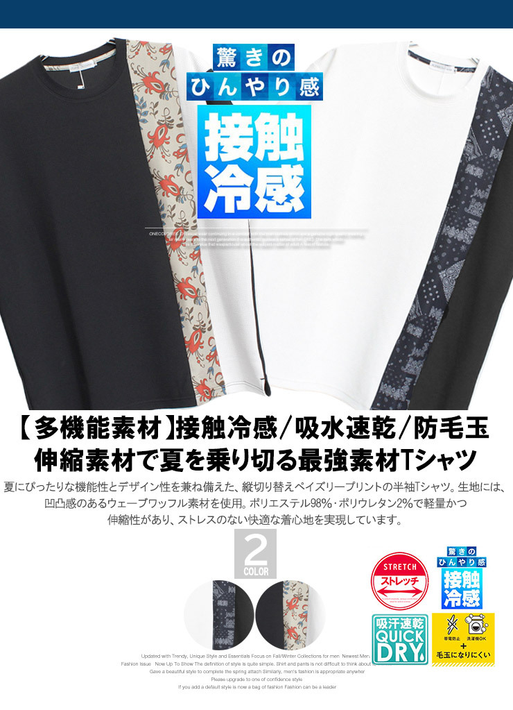 | 商品説明 | 夏にぴったりな機能性とデザイン性を兼ね備えた、縦切り替えペイズリープリントの半袖Tシャツ。 |