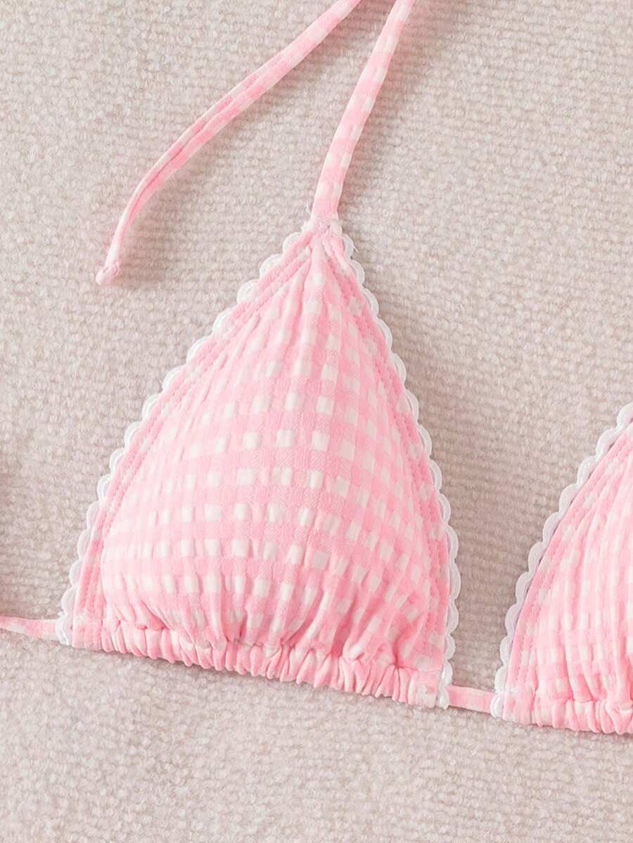 レディース 水着 ビキニセット テクスチャ生地ギンガムフローラルエッジトライアングルカップホルターサイドタイ2ピースピンクビキニセ
