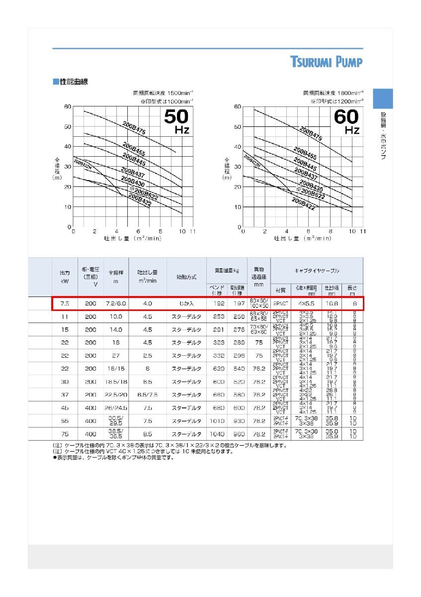 〈ツルミ〉200B47.5 汚物用 水中ノンクロッグポンプ B型 4極モーター 非自動形 口径200mm 60Hz 西日本用 三相200V 出力7.5kW ツルミポンプ
