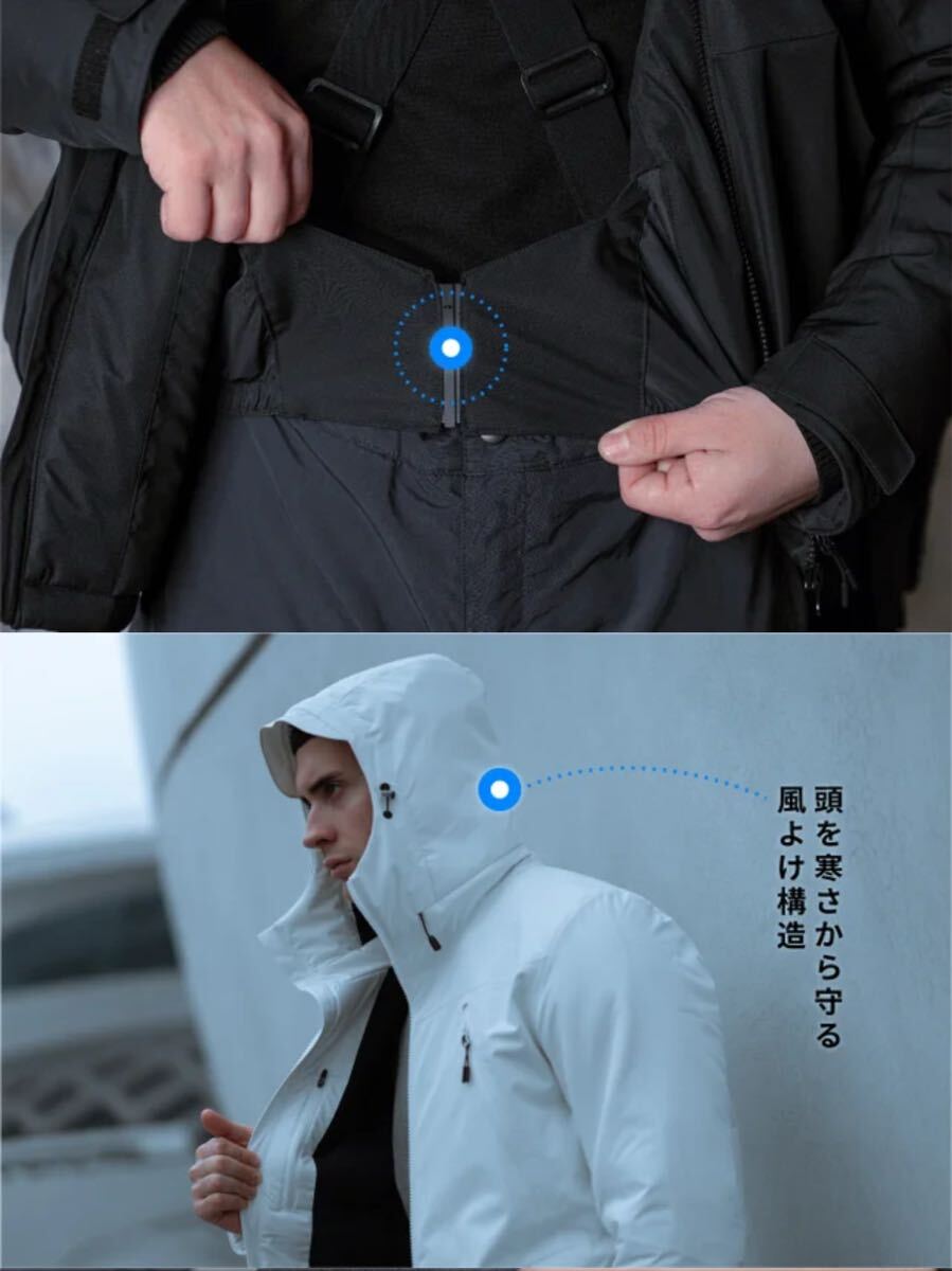 腰部分にジャケットの下端から冷たい風や吹雪が流れ込むのを防ぎ、裾(すそ)から中の熱が漏れ出るのも防ぐベルトを備えています。