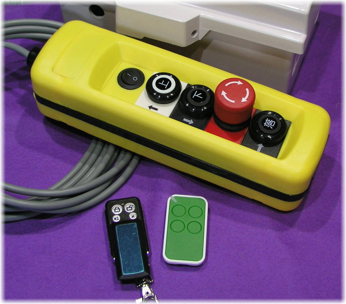 ※メインスイッチに連続回転と寸動を切替えるトグルスイッチが有ります。停止ボタンは押し込まれたままとなる為、安全スイッチの代わりになります。コードレスリモコンはロープトラブル時、1人で対応出来便利です。(オプションスイッチもご用意できます)