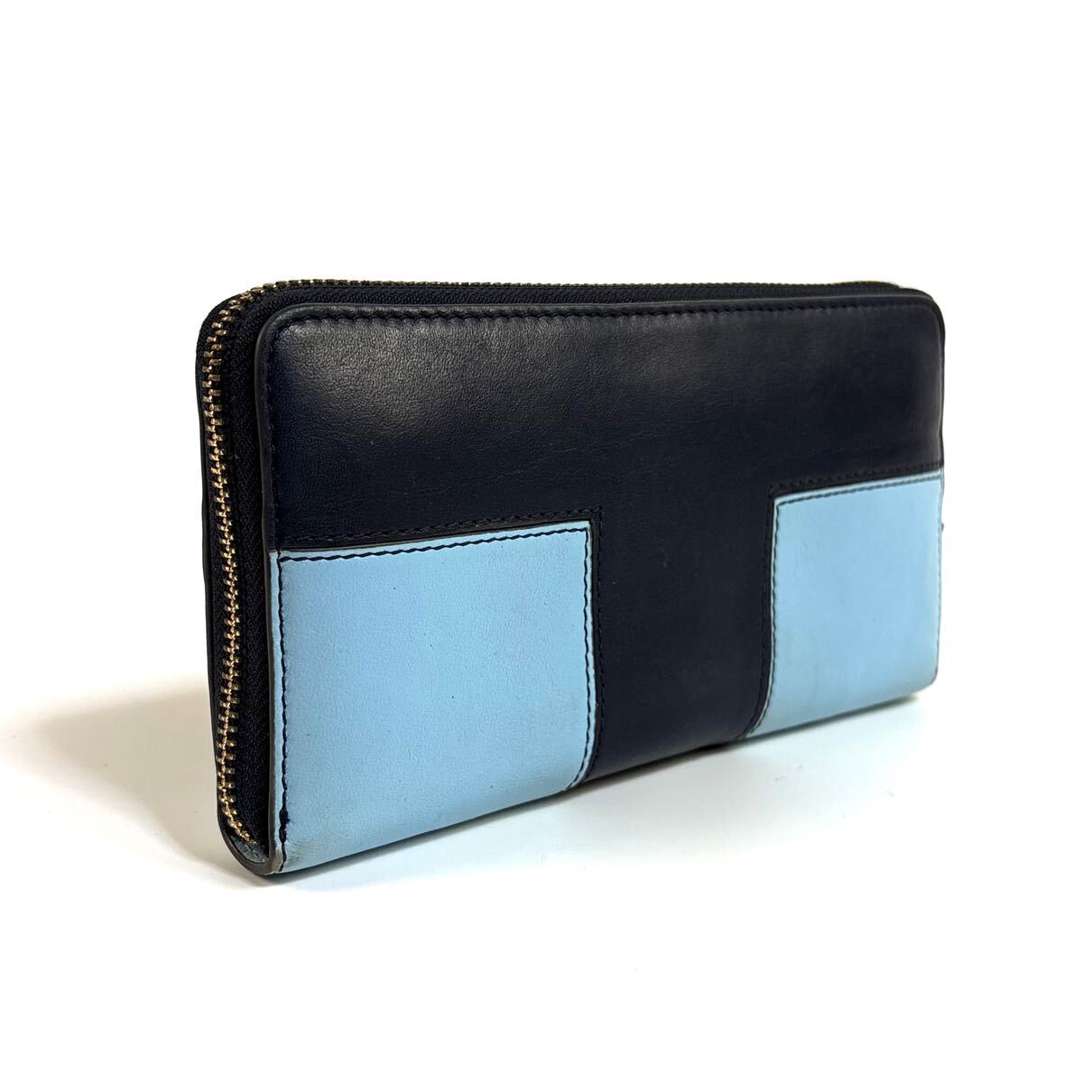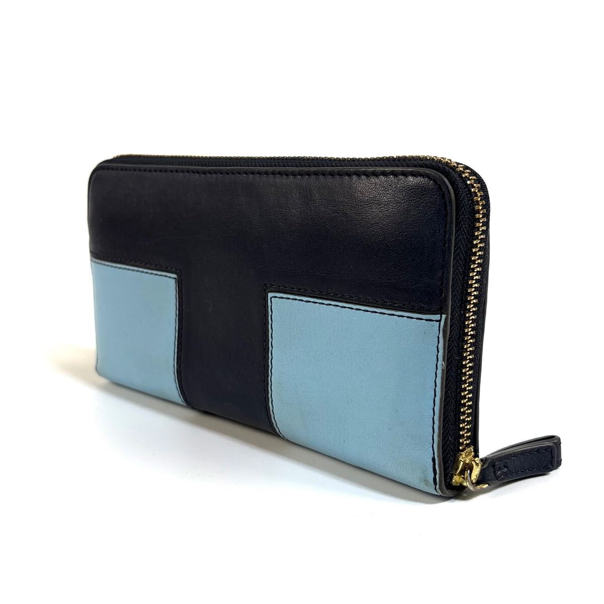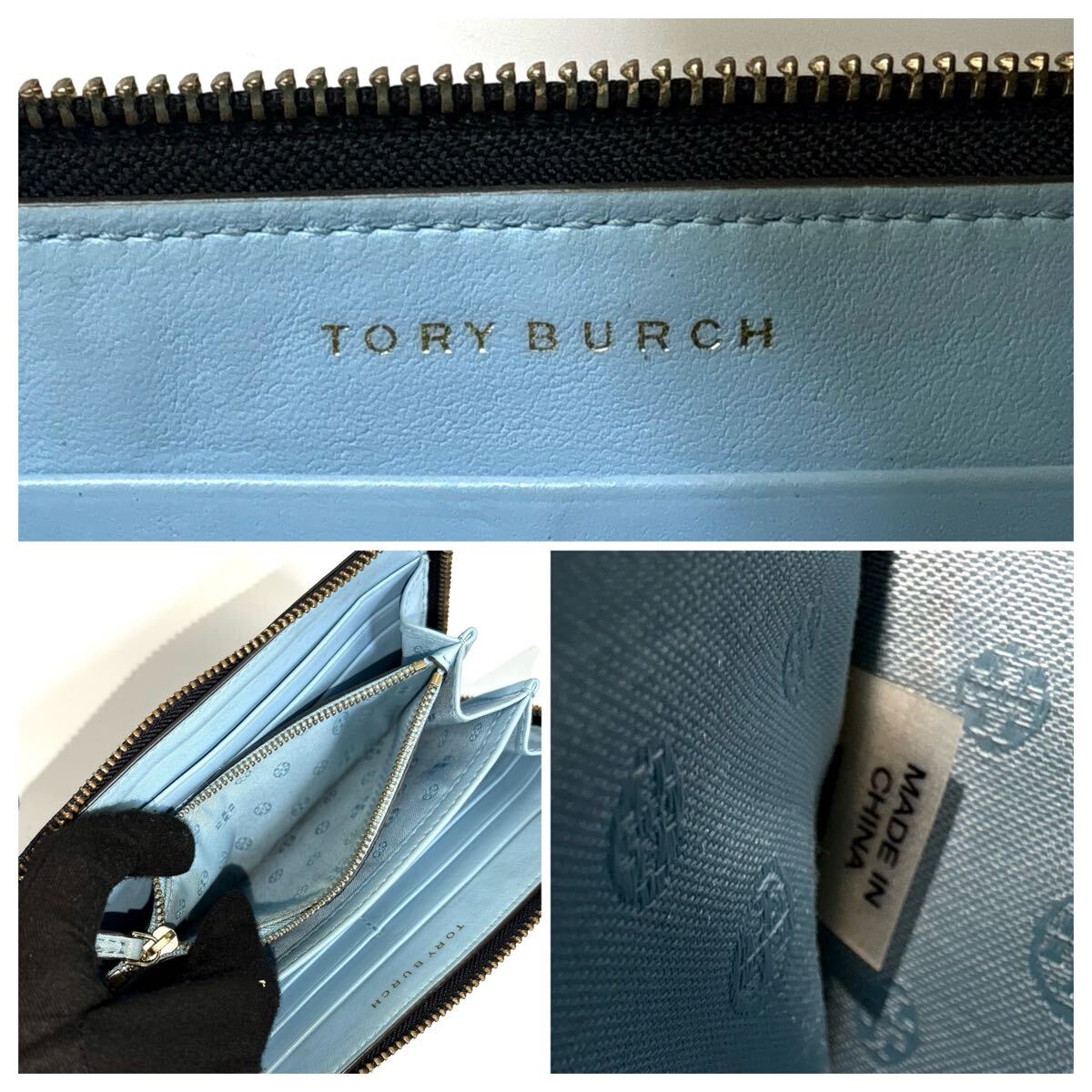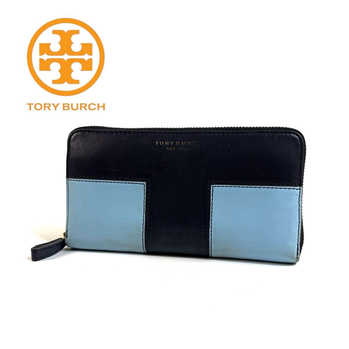 【美品】TORY BURCH トリーバーチ レザー ラウンドファスナー ロング ウォレット 長財布 小銭 カード 入れ有り バイカラー ブルー |