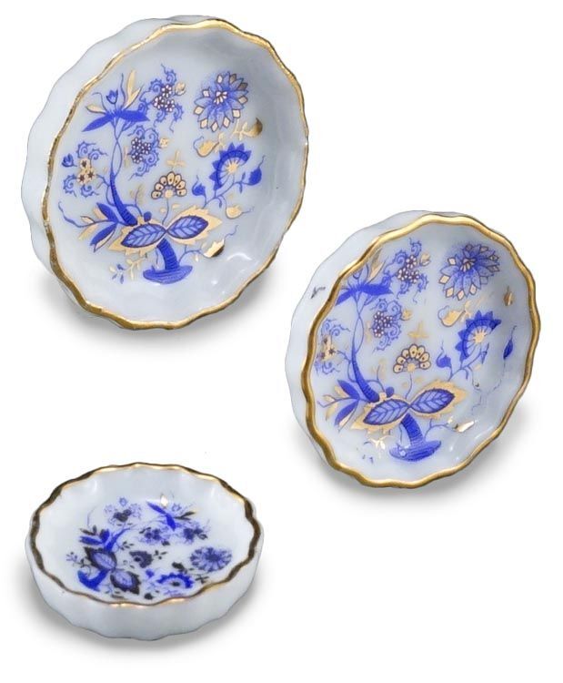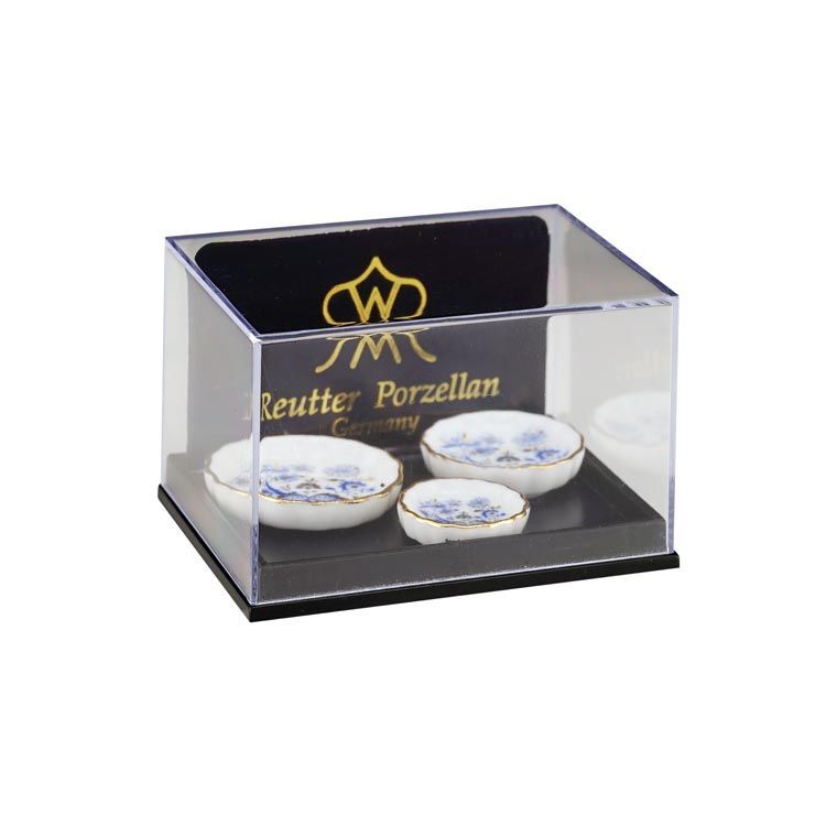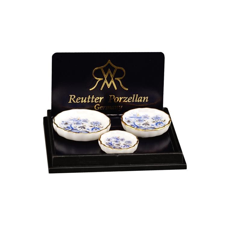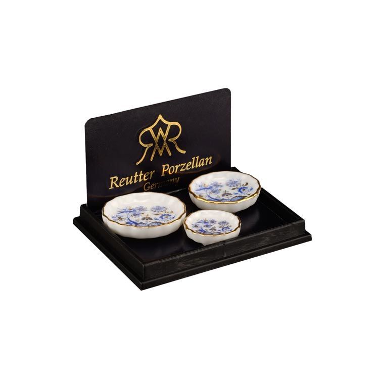ドイツロイター社製のミニチュア陶器皿です。3枚セットで、直径23?、21mm、11?です。かわいく重ねられるのがいいですね!ぜひあなたのドールハウスに!スケールは1/12です。アクリルケース入りです。アクリルケースからは取り出せます。