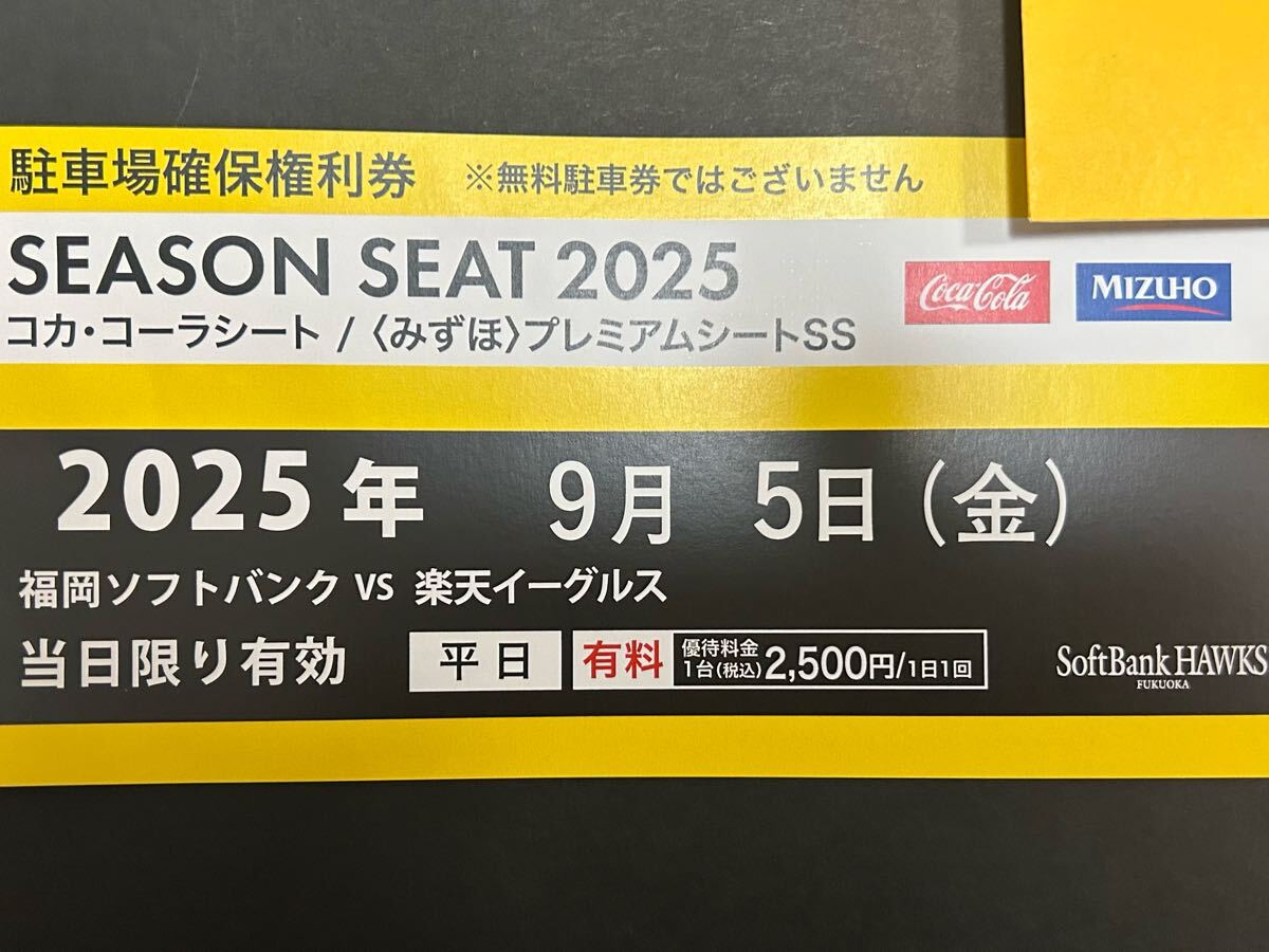 無料駐車券ではありません。みずほpaypayドーム駐車場に入場し、料金所で確保券+駐車代2,500円をお支払いください。満車の場合でも駐車可能です。