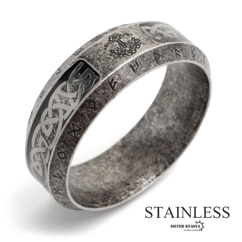 | 商品概要 | ■幻想的なケルト文様 ケルト文様とケルト文字の組み合わせで幻想的な雰囲気のあるリング。アンティークなシルバーカラーが映えます。 ■ステンレス素材を使用 金属部分は頑丈なことで知られるステンレス素材を採用。耐久性はもちろん耐水性も高く水場での着用も可能。金属アレルギーも出にくいとされている金属です。 |