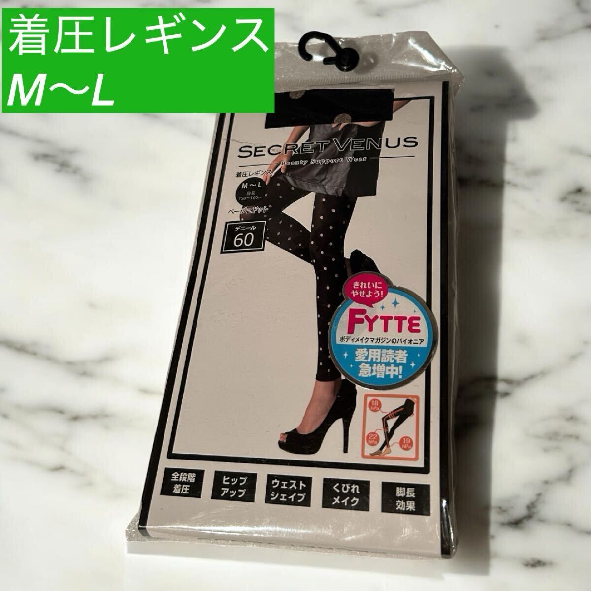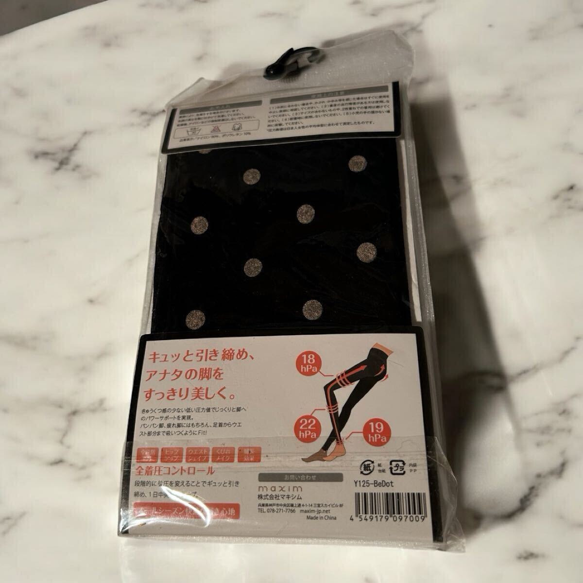 着圧レギンス、M〜Lサイズ、ドット柄デザイン、3段階の着圧レベルで美脚効果をサポート。